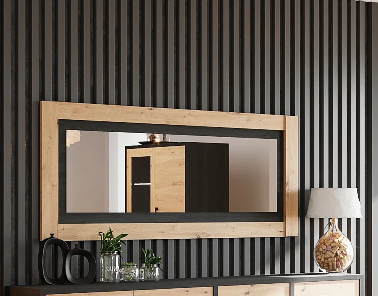 Spiegel Wiva met rand van spaanplaat in zwart en houten look.