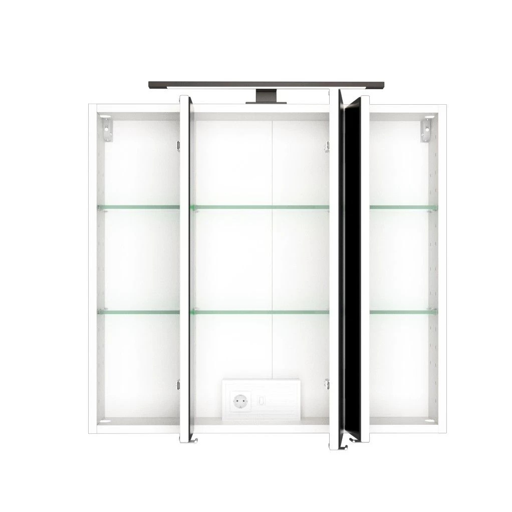 Spiegelkast Dusan met 3 deuren en 6 glazen legplanken, vervaardigd uit witte spaanplaat. Ledverlichting & schakelaar inbegrepen. Â