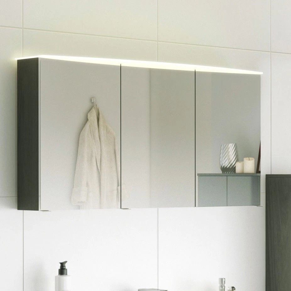 Spiegelkast Florent in grafietgrijs. Uitgerust met 3 deuren, 6 glazen legplankjes en ledverlichting.