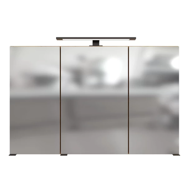Spiegelkast Malvo 100x20x64cm uit spaanplaat. Met 3 spiegeldeuren en 6 glazen legplanken. Inclusief verlichting en stopcontact. Verlichting 9,6 Watt, 700 Lumen, 4000 Kelvin.