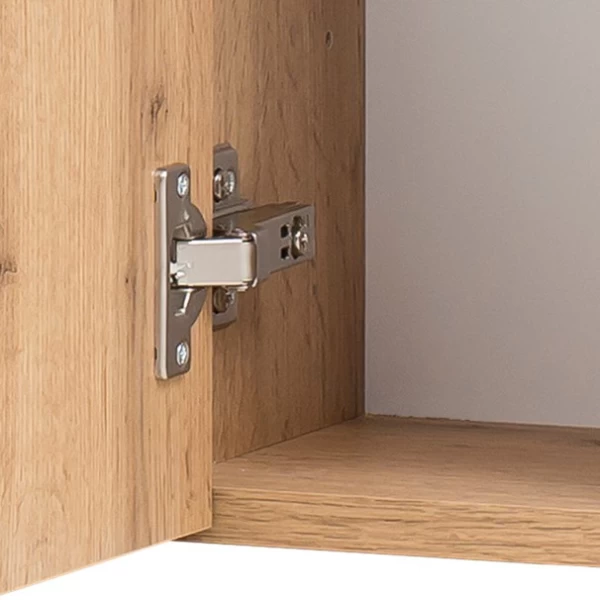 De meubelen van de Pisca-collectie beantwoorden perfect aan de definitie van wat een badkamer hoort te zijn. Deze spiegelkast is gemaakt uit spaanplaat en MDF, afgewerkt met melamine in eiklook. Achter de drie deuren zijn 6 glazen legplanken voorzien zodat je plaats genoeg hebt voor je verzorgingsproducten. De kast is bovendien uitgerust met LED-verlichting en een stopcontact. Deze collectie bestaat ook in wit en grafietgrijs. Ontdek het volledige gamma op de website.Â