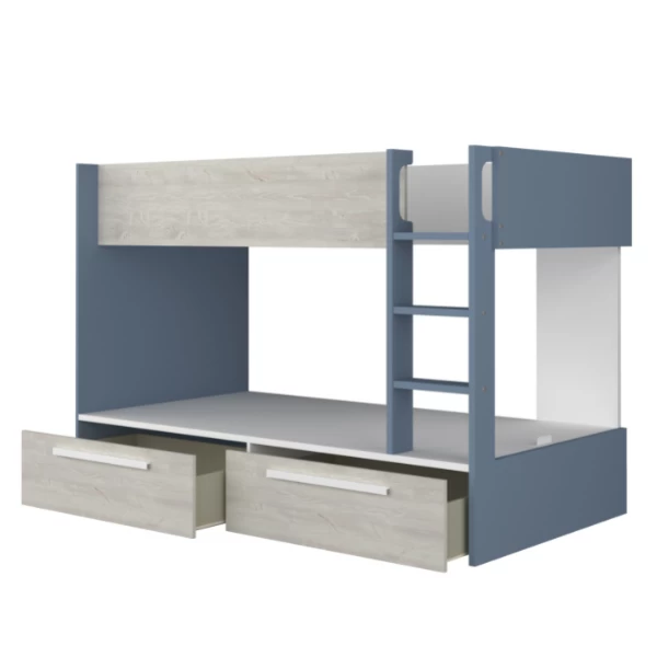 Stapelbed Fleur geeft je de mogelijkheid de ruimte in jouw logeerkamer of gedeelde kinderkamer optimaal te benutten. Door de blauwe accenten straalt het geheel rust en stabiliteit uit. Het stapelbed biedt plaats voor 2 matrassen van 90×200 cm. Deze matrassen zijn niet inbegrepen en kunnen aangekocht worden op onze website. Het bed beschikt over twee bedlades waarin je heel wat spullen (speelgoed, beddengoed, knuffels etc.) kunt opbergen. Om ongelukken te vermijden is het laddertje bovendien voorzien van gebogen handgrepen en anti-slipstroken. Daarnaast beschikt het bed over een hoge uitvalbeveiliging. Je kan je (klein)kinderen dus met een gerust hart laten slapen. Stapelbed Fleur is gemaakt van spaanplaat en werd afgewerkt in hoogwaardig melamine.