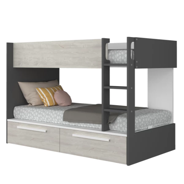 Stapelbed Fleur geeft je de mogelijkheid de ruimte in jouw logeerkamer of gedeelde kinderkamer optimaal te benutten. Door zijn neutrale kleur past het bed in zowel een jongens- als meisjeskamer en trekt het niet te veel de aandacht. Het stapelbed biedt plaats voor 2 matrassen van 90×200 cm. Deze matrassen zijn niet inbegrepen en kunnen aangekocht worden op onze website. Het bed beschikt over twee bedlades waarin je heel wat spullen (speelgoed, beddengoed, knuffels etc.) kunt opbergen. Om ongelukken te vermijden is het laddertje bovendien voorzien van gebogen handgrepen en anti-slipstroken. Daarnaast beschikt het bed over een hoge uitvalbeveiliging. Je kan je (klein)kinderen dus met een gerust hart laten slapen. Stapelbed Fleur is gemaakt van spaanplaat en werd afgewerkt in hoogwaardig melamine.Â