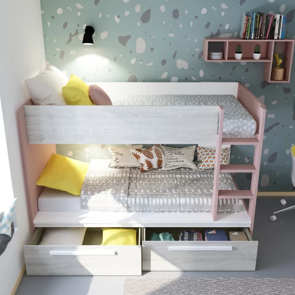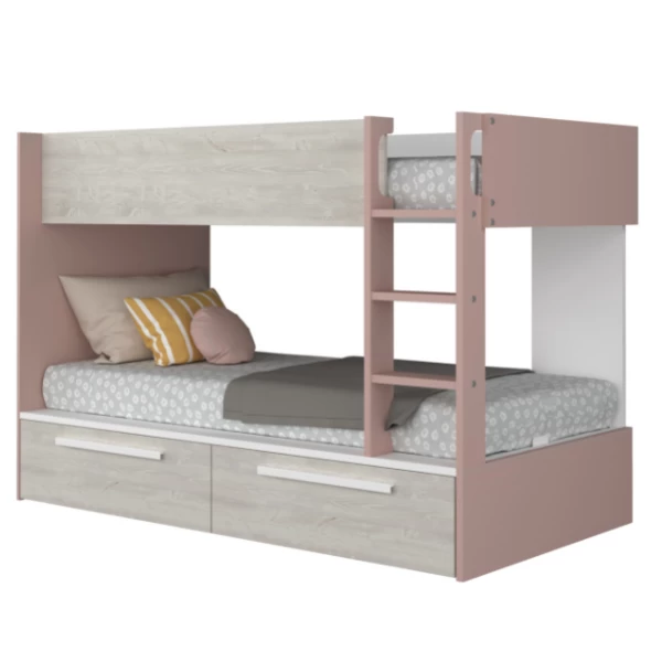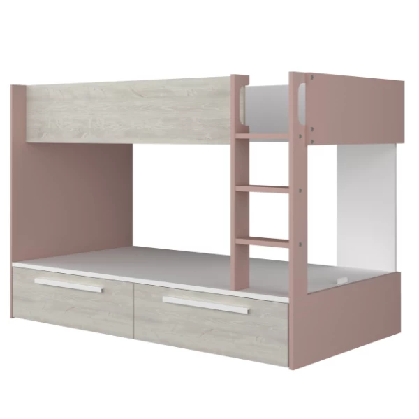 Stapelbed Fleur geeft je de mogelijkheid de ruimte in jouw logeerkamer of gedeelde kinderkamer optimaal te benutten. Door de oudroze accenten in het stapelbed krijgt de kamer een lieflijke uitstaling. Het stapelbed biedt plaats voor 2 matrassen van 90×200 cm. Deze matrassen zijn niet inbegrepen en kunnen aangekocht worden op onze website. Het bed beschikt over twee bedlades waarin u heel wat spullen (speelgoed, beddengoed, knuffels etc.) kunt opbergen. Om ongelukken te vermijden is het laddertje bovendien voorzien van gebogen handgrepen en anti-slipstroken. Daarnaast beschikt het bed over een hoge uitvalbeveiliging. U kan uw (klein)kinderen dus met een gerust hart laten slapen. Stapelbed Fleur is gemaakt van spaanplaat en werd afgewerkt in hoogwaardig melamine.