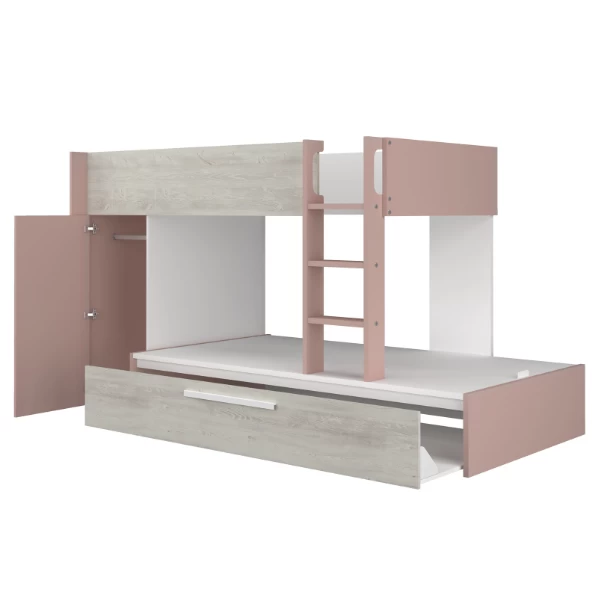 Stapelbed Fleur geeft je de mogelijkheid de ruimte in jouw logeerkamer of gedeelde kinderkamer optimaal te benutten. Door de oudroze accenten in het stapelbed krijgt de kamer een lieflijke uitstaling. Het stapelbed biedt plaats voor 2 matrassen van 90×200 cm. In een uitschuifbare bedlade is er ook nog plaats voor een matras van 90×190 cm. Deze matrassen zijn niet inbegrepen en kunnen aangekocht worden op onze website. Het bed beschikt over een kledingkast met kledingroede en legplank. Stapelbed Fleur is gemaakt van spaanplaat en werd afgewerkt in hoogwaardig melamine. Om ongelukken te vermijden is het laddertje voorzien van gebogen handgrepen en anti-slipstroken.