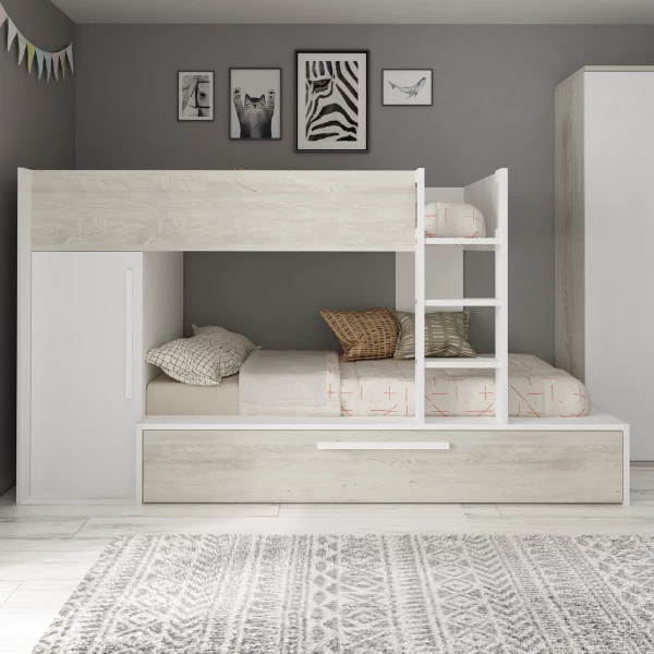 Stapelbed Fleur geeft je de mogelijkheid de ruimte in jouw logeerkamer of gedeelde kinderkamer optimaal te benutten. Door zijn neutrale kleur past dit stapelbed in elke kamer, hoe sober of kleurrijk deze ook is aangekleed. Het stapelbed biedt plaats voor 2 matrassen van 90×200 cm. In een uitschuifbare bedlade is er ook nog plaats voor een matras van 90×190 cm. Deze matrassen zijn niet inbegrepen en kunnen aangekocht worden op onze website. Het bed beschikt over een kledingkast met kledingroede en legplank. Stapelbed Fleur is gemaakt van spaanplaat en werd afgewerkt in hoogwaardig melamine. Om ongelukken te vermijden is het laddertje voorzien van gebogen handgrepen en anti-slipstroken.