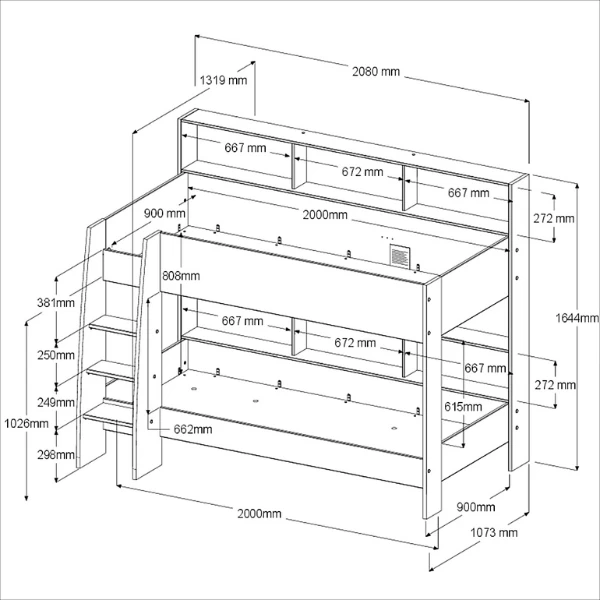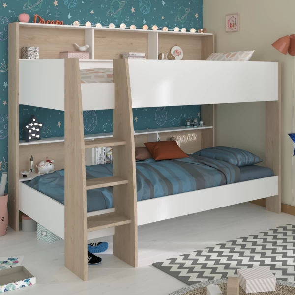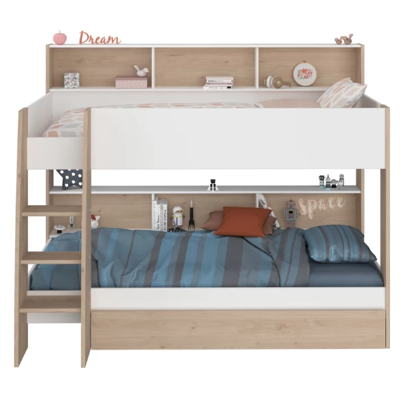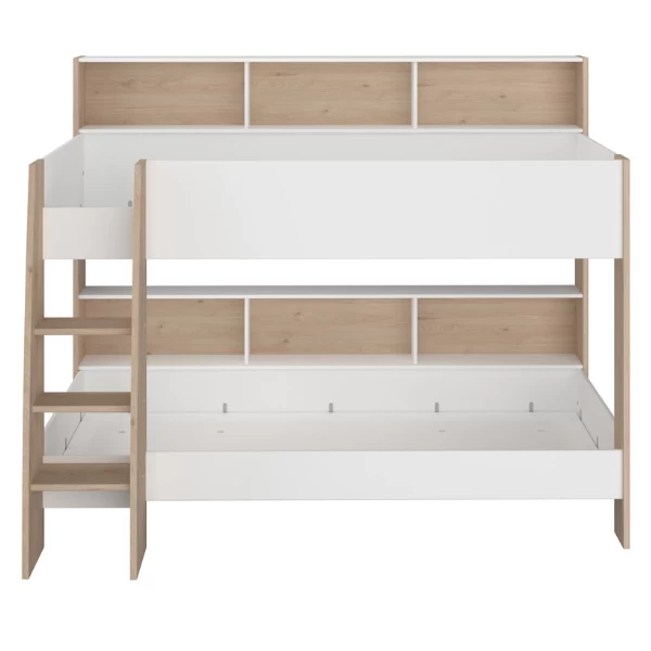 Stapelbed Shelby 208x132x165cm uit spaanplaat met afwerking in eikdecor en wit. Geschikt voor 2x een matras van 90x200cm (matras niet inbegrepen). Voorzien van drie open opbergvakken naast elk bed.