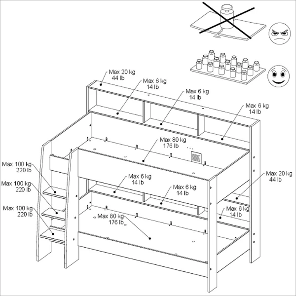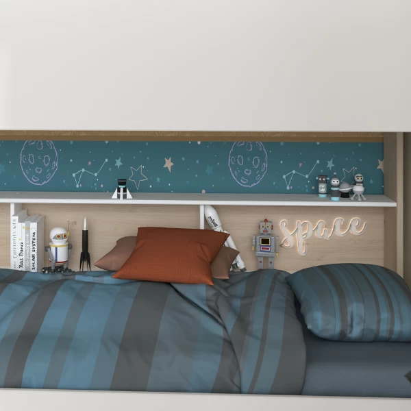 Het stapelbed Shelby biedt twee slaapplaatsen aan, zonder dat het bed veel plaats inneemt. Het bed is gemaakt uit stevige spaanplaat in een licht decor van Jackson eik en wit. Het stapelbed is geschikt voor tweemaan een matras van 90×200. Het moderne kleur en handige formaat zorgen ervoor dat dit bedmeubel zowat in elk slaapkamerinterieur past. Bovendien is het Shelby-stapelbed erg praktisch, aangezien je bij elke slaapplaats over drie open opbergvakken beschikt. Zo kan elk kind hun eigen stek creëren. De matrasbodem is inbegrepen, de matrassen zelf zijn dat niet. Daarvoor raden wij jou onze Comfort-matras aan, prijs-kwaliteit een uitstekende kindermatras. Optioneel kan je een lade voor onder het bed bijbestellen voor bijkomende opbergruimte. Laat je fantasie de vrije loop en schep de sfeer van een blokhut in jouw kinderkamer!
