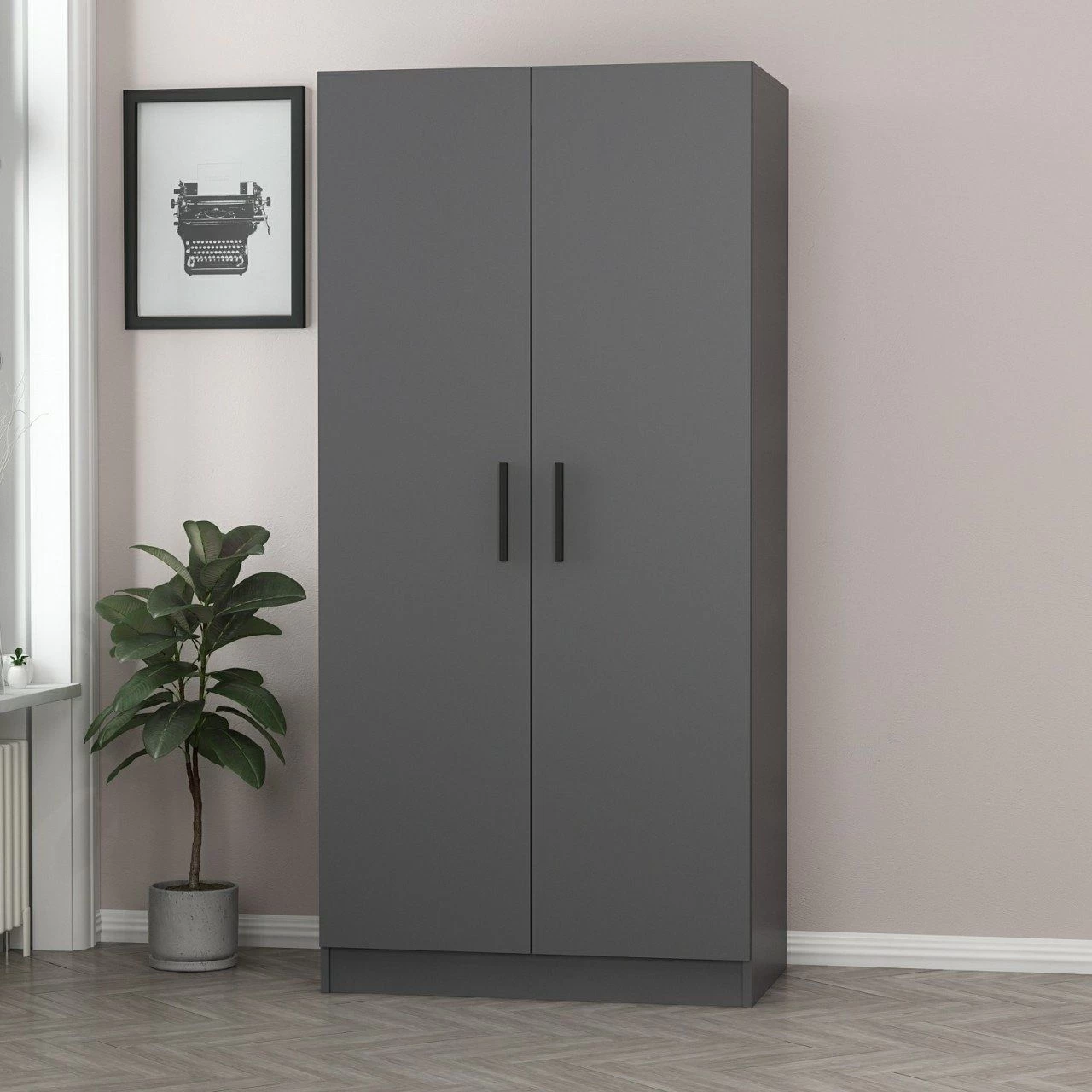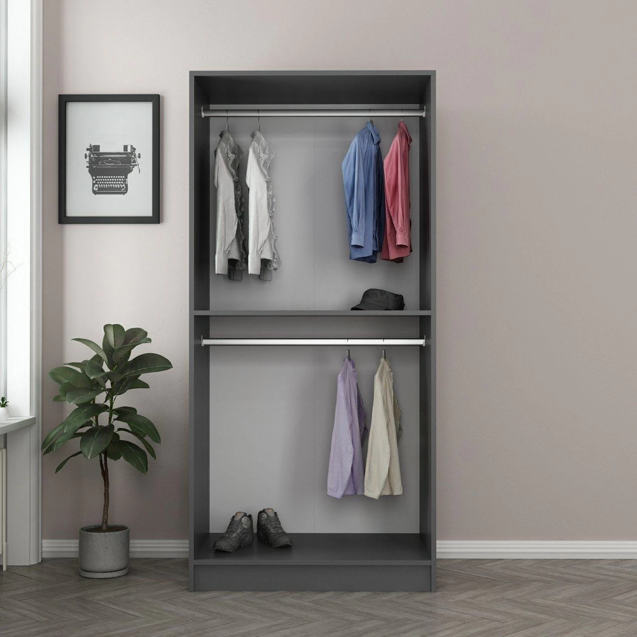 Afgewerkt in een strakke antracietkleur voegt deze kast een vleugje elegantie toe aan elke kamer. De tijdloze tint past bij verschillende interieurstijlen, van modern tot klassiek, en zorgt voor een naadloze integratie met je bestaande inrichting. Verrijk je ruimte met een kledingkast die niet alleen functioneel is, maar ook de algehele esthetiek verbetert.