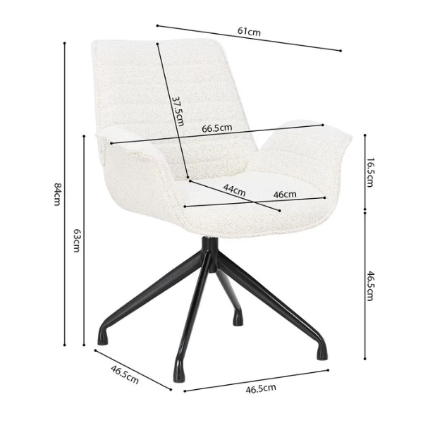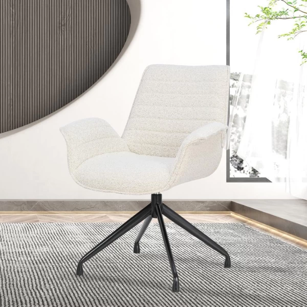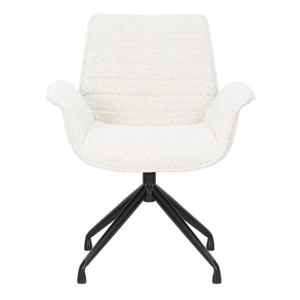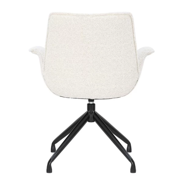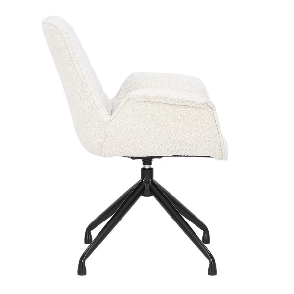 Stoel Amir heeft metalen poten en een Bouclé-bekleding in wit. De stoel is draaibaar.