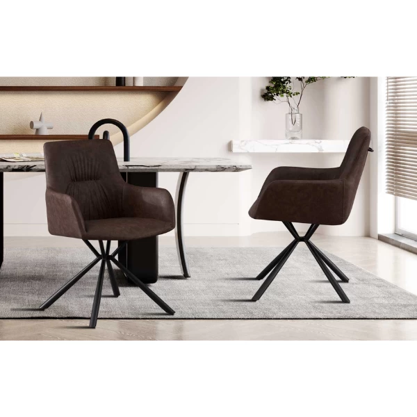 De ‘Lyra’ PU Bruine Stoel: Modern ontwerp met metalen poten en PU bekleding. H-H 86 x B-L 55,5 x D-P 64,5 cm. Comfortabel en stijlvol zitten.