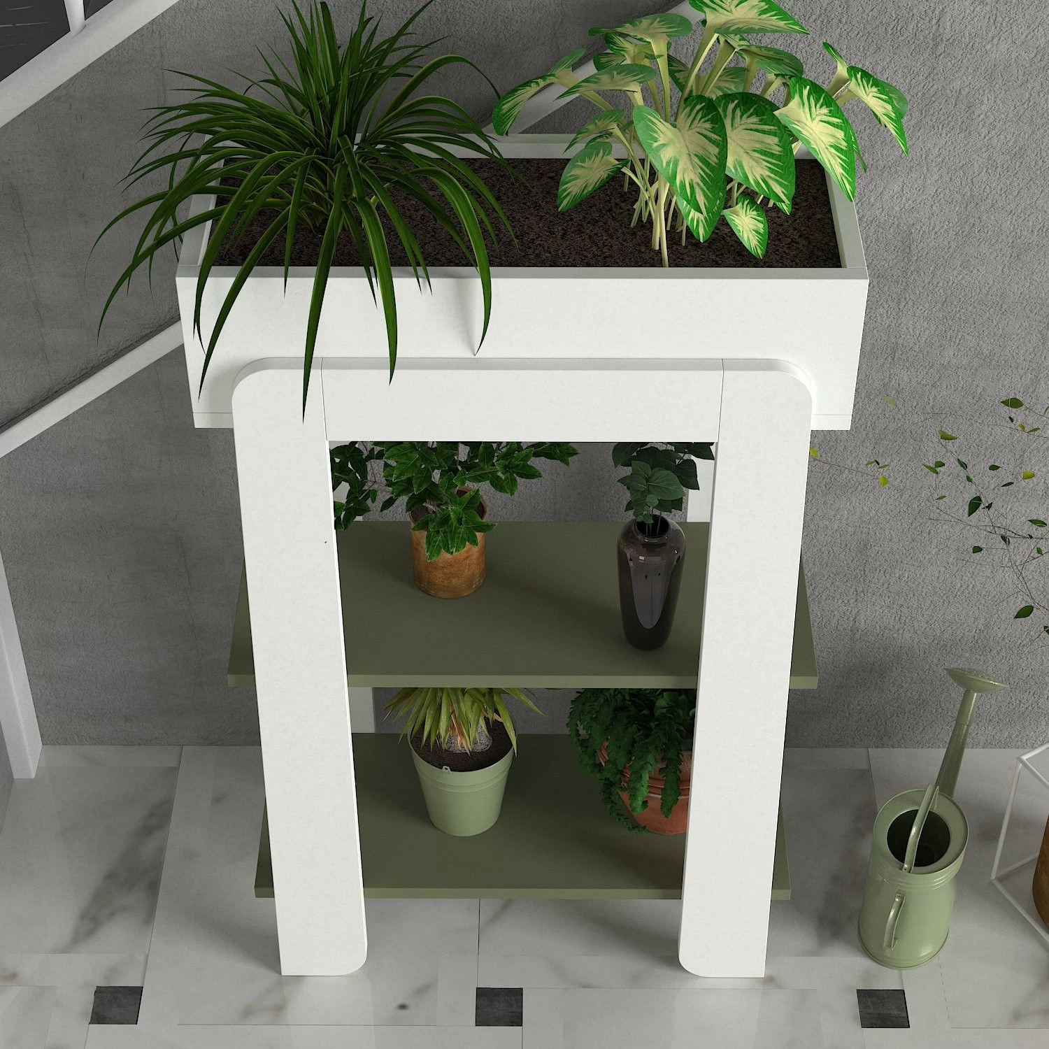 De Talon Plantenstandaard wordt geleverd in een visueel aantrekkelijke witgroene kleurencombinatie. De helderwitte afwerking brengt een vleugje verfijning en elegantie in elke kamer, terwijl de subtiele groene accenten een frisse, levendige uitstraling geven. Deze kleurencombinatie vult moeiteloos een breed scala aan interieurstijlen aan, waardoor deze plantenstandaard een veelzijdige keuze is voor elk huis.