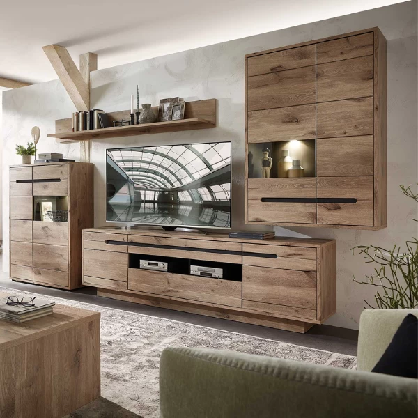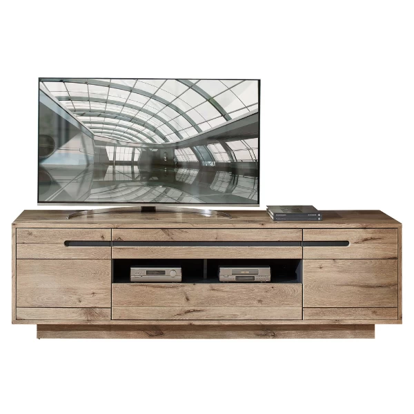 TV-meubel Bellini 205x44x63cm uit spaanplaat en MDF. Afwerking in eiklook en antraciet. Met twee deuren en twee lades.