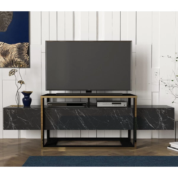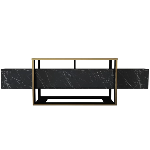 TV-meubel Melvin 160×46,1×49,8cm uit spaanplaat met afwerking in imitatiemarmer en goudkleurig metaal.