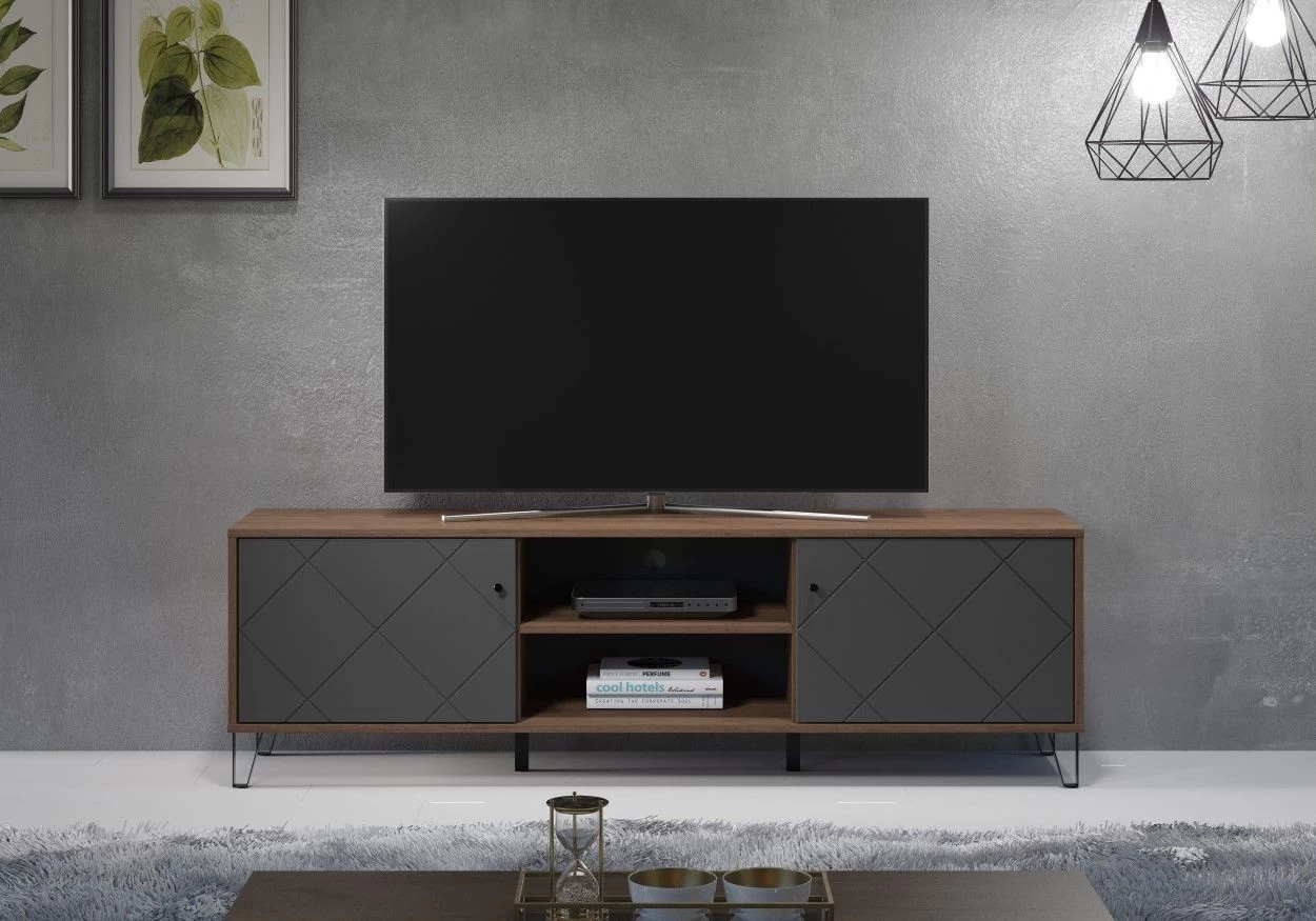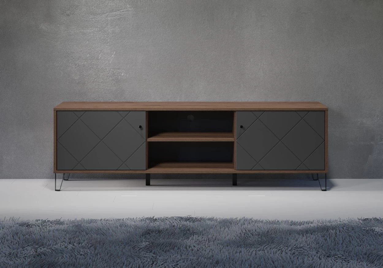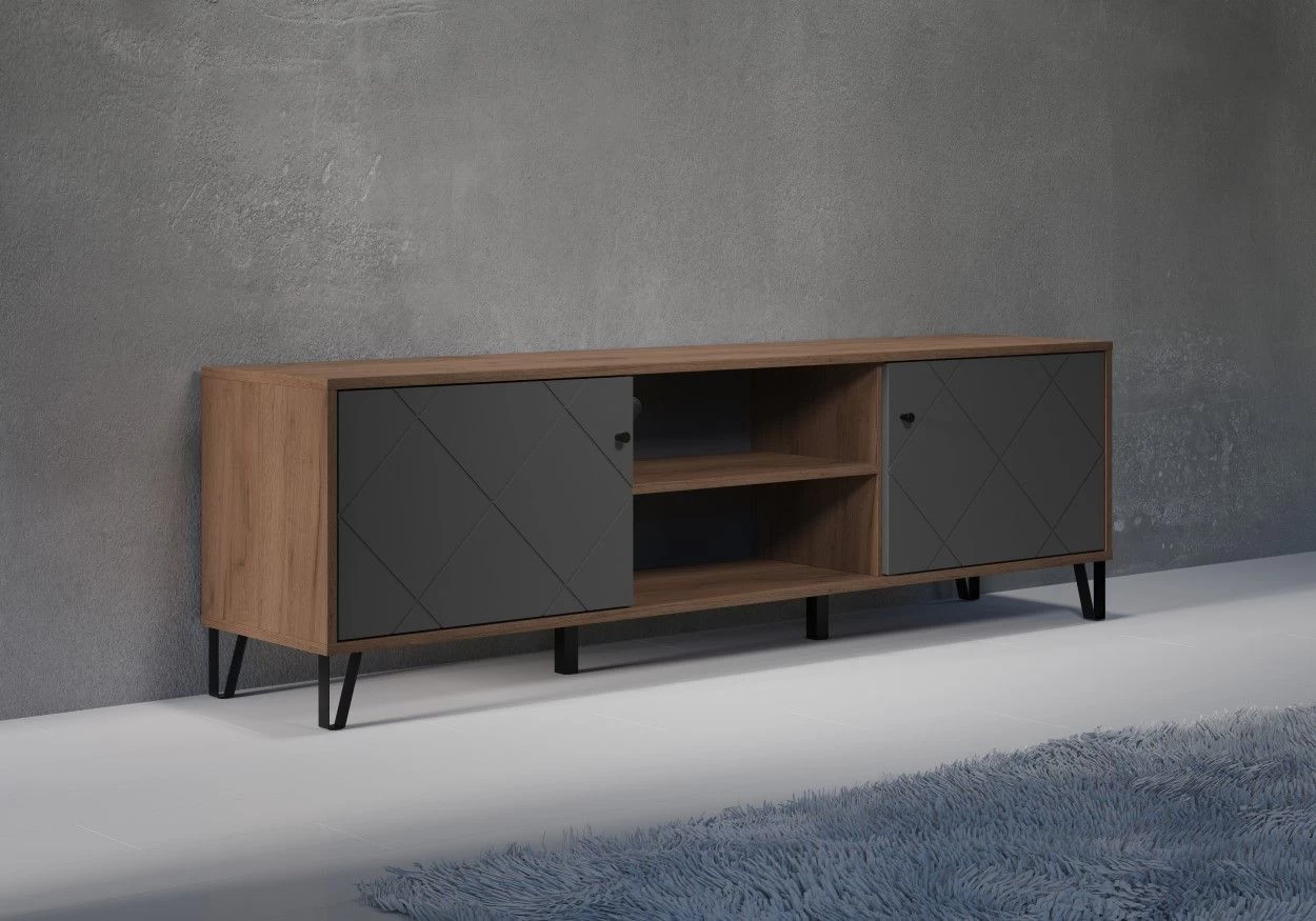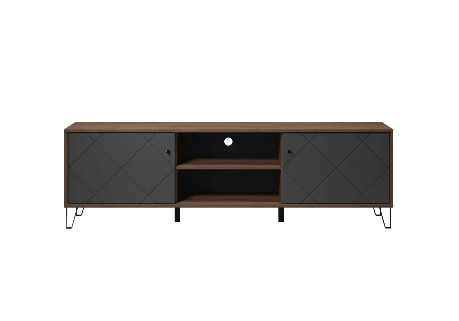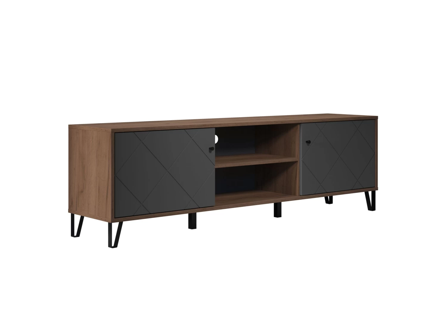 Het meubel heeft 2 open vakken en 2 deuren met een ruitpatroon, die voldoende opbergruimte bieden voor al je media-apparaten, dvd’s en meer. De romp in eiken Craft Gold-decor voegt een vleugje elegantie toe aan je ruimte, terwijl de voorkant in decoratieve diepgetrokken look een eigentijds ontwerp creëert.
