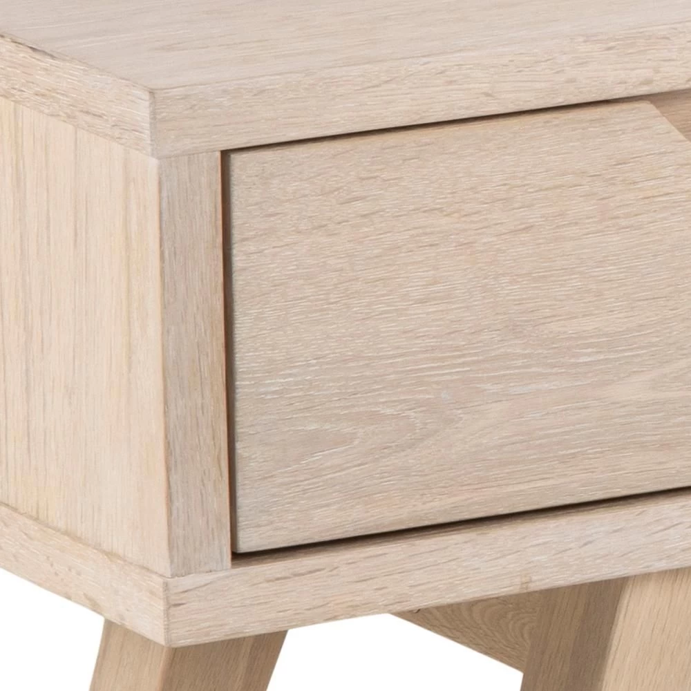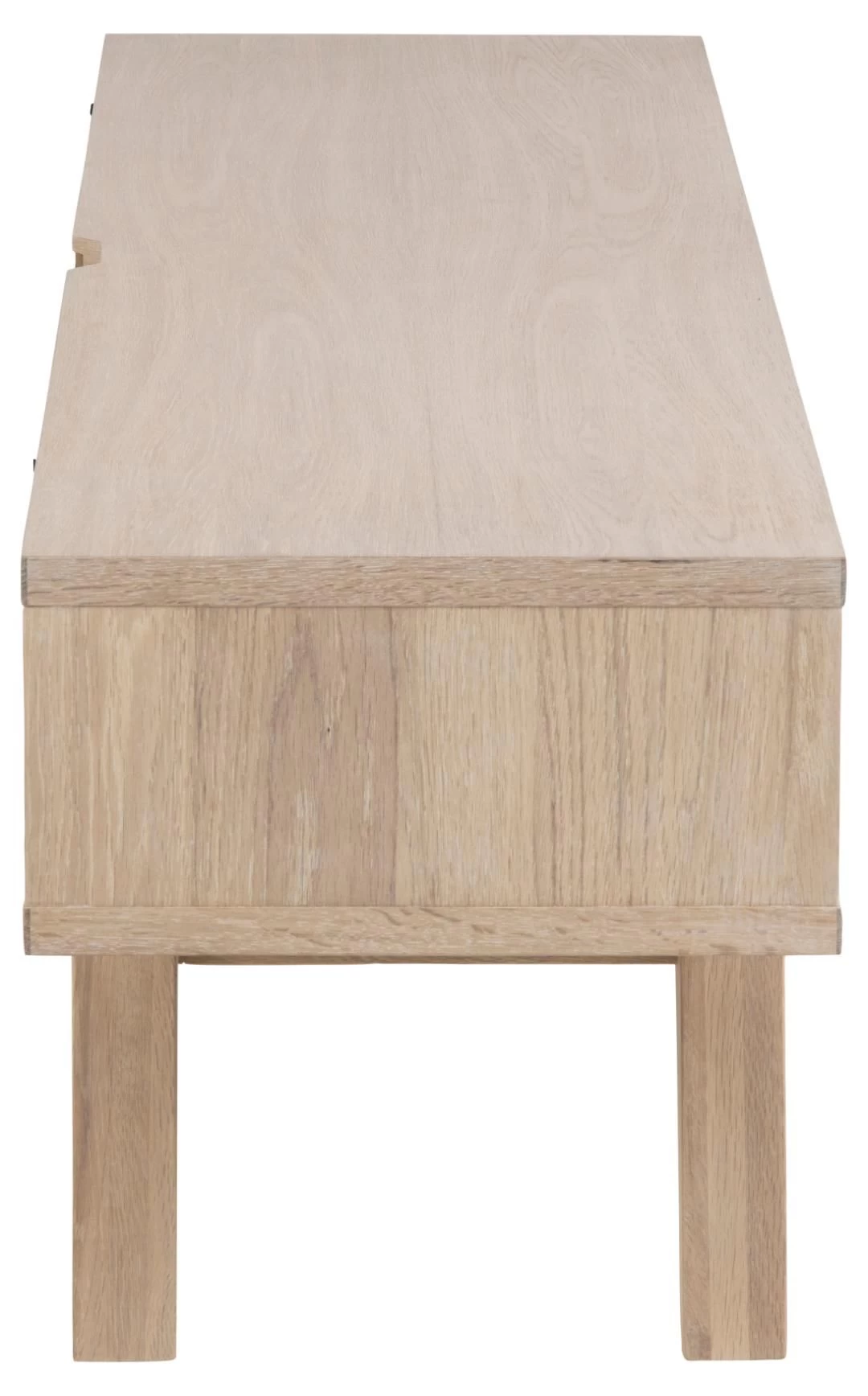 Tv-meubel Sieg met 2 lades en 1 open vakje, gemaakt in massief eikenhout en afgewerkt met wit gepigmenteerde olie en fineer.