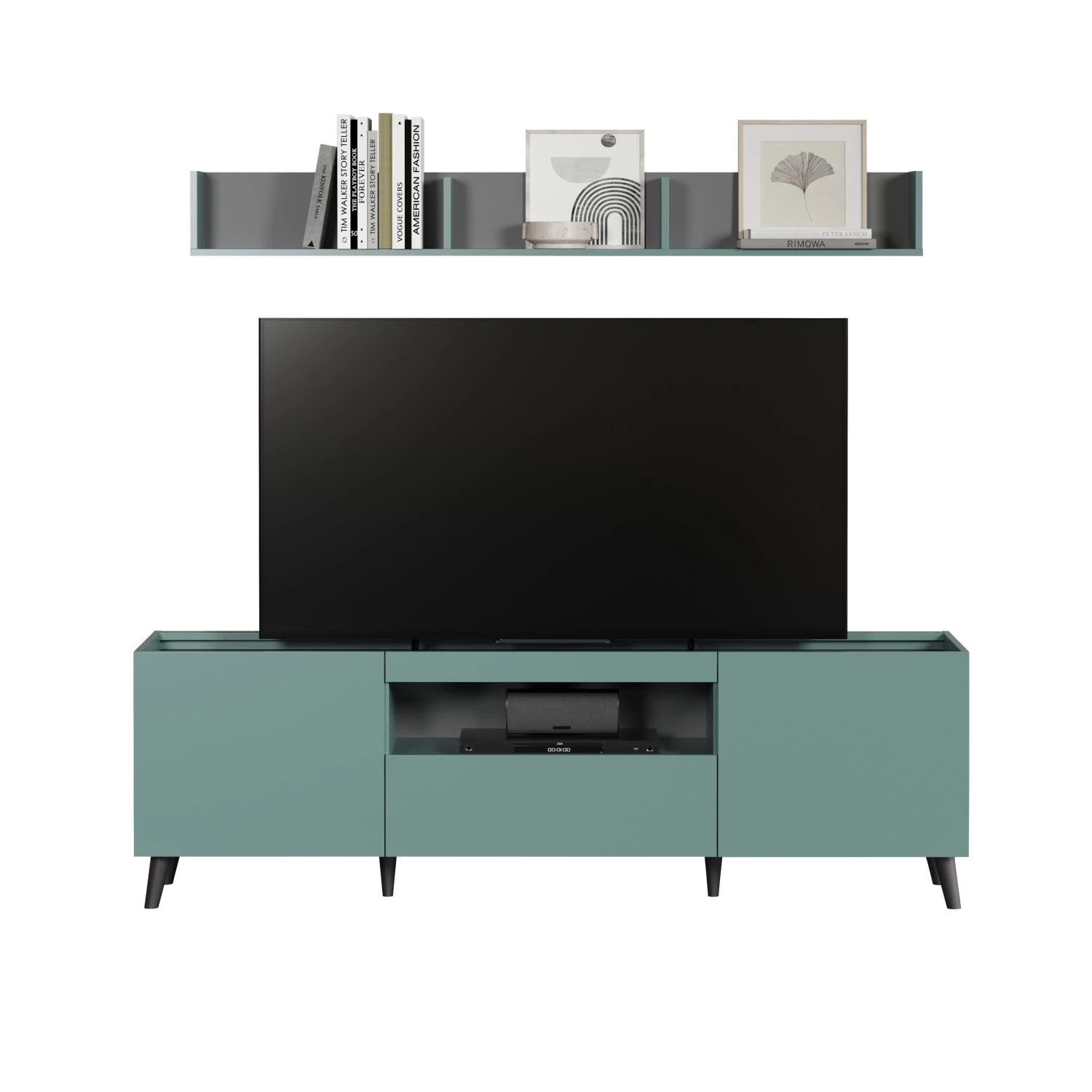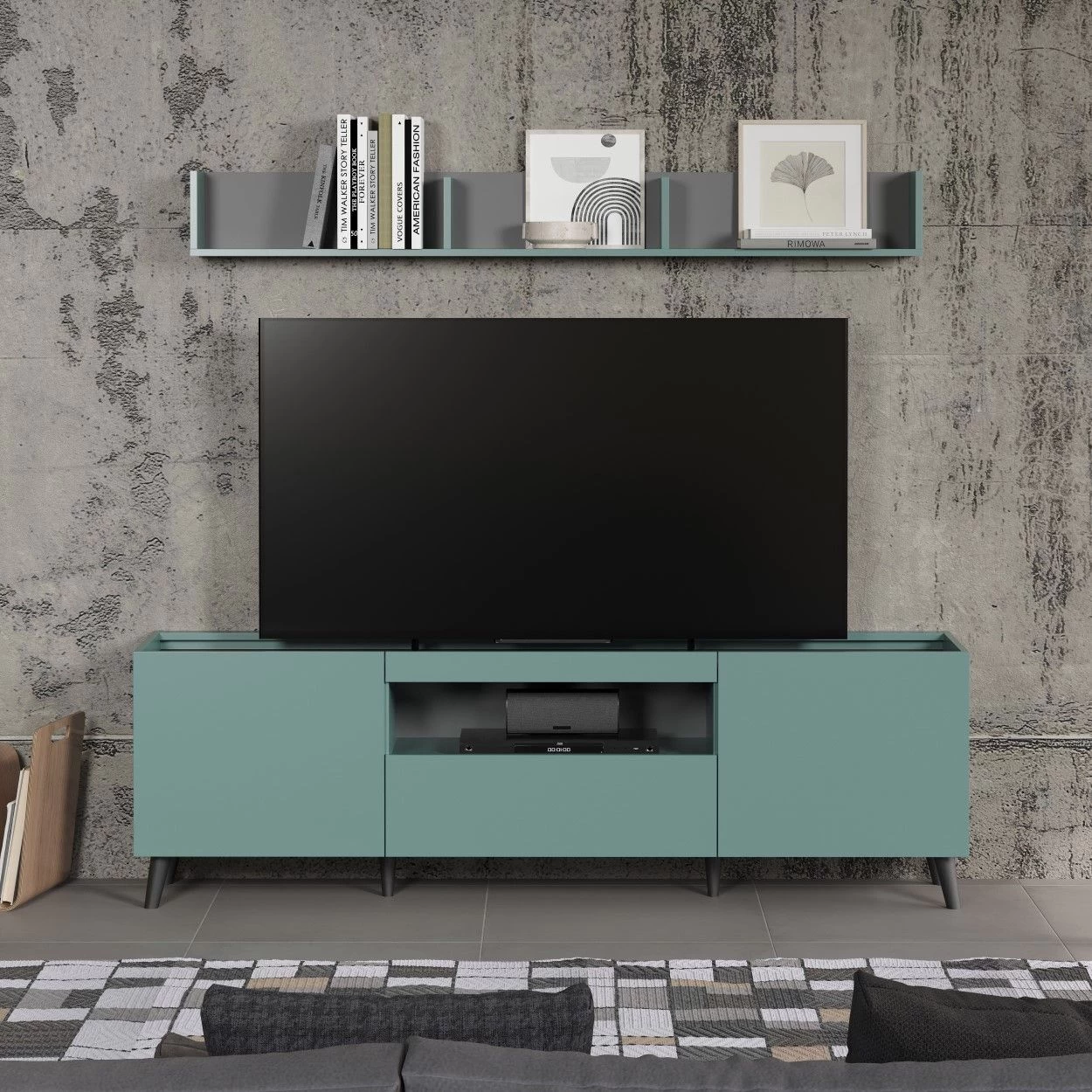Ontdek onze elegante Melton-woonkamerset met een eigentijds ontwerp dat perfect is voor moderne interieurs. Deze set bevat twee draaideuren, een handige lade, een open opbergvak en een bovenste plank om je elektronica en decoratieve items te huisvesten. Het harmonieuze kleurenpalet van antraciet en blauw voegt een vleugje stijl toe aan je woonkamer. Geniet van je favoriete programma’s en films in stijl met deze Melton-woonkamerset