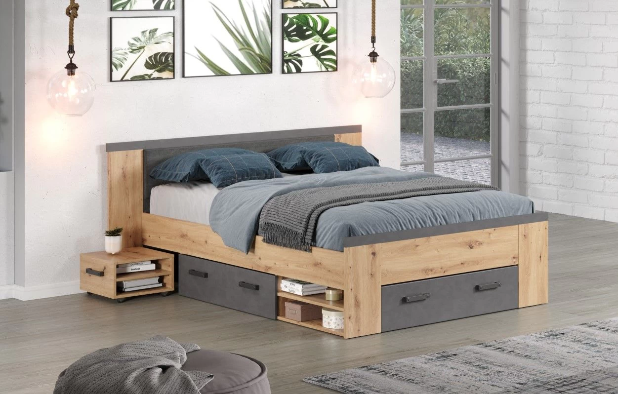 Dit bed is uitgerust met twee bijpassende nachtkastjes, drie uitschuifbare lades en vier open opbergvakken. Hierdoor heb je alles wat je nodig hebt binnen handbereik, of het nu gaat om boeken, kleding of andere persoonlijke bezittingen.