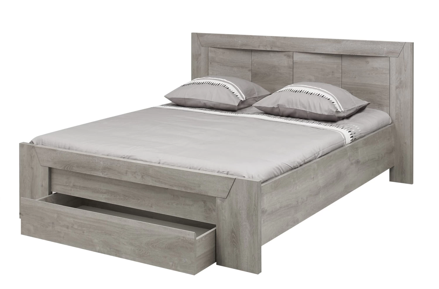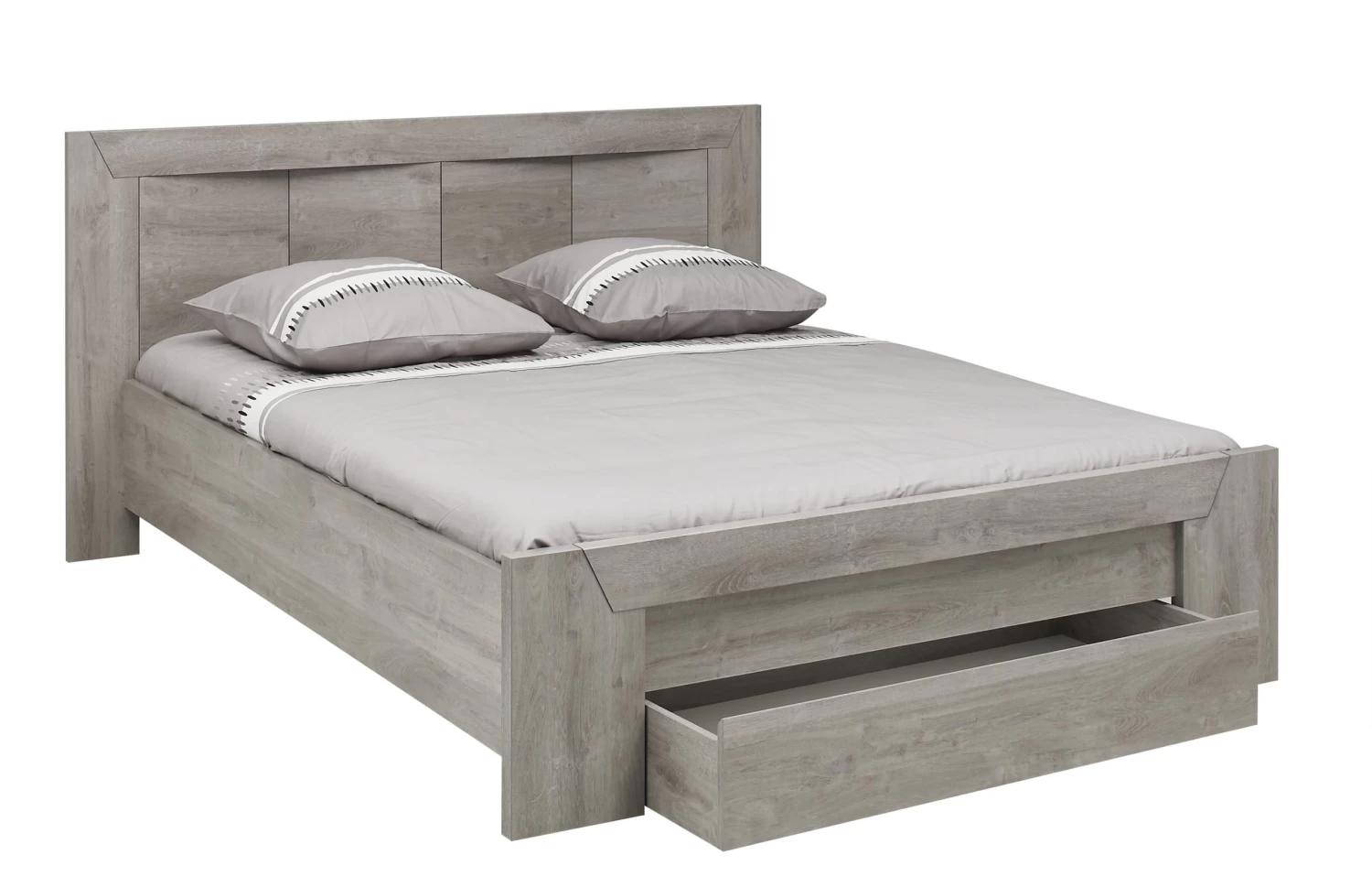 Bij dit tweepersoonsbed met opberglade staan de hoofdbordpanelen in reliëf voor een gegarandeerd visueel effect. Het bed is geschikt voor een matras van 160 x 200 cm en 2 lattenbodems van 80 x 200 cm (middenpoten vereist). Je kunt ook een achterbouw met 2 rekjes aan het bed toevoegen. De matras, lattenbodems, middenpoten en achterbouw zijn apart verkrijgbaar in de webshop.