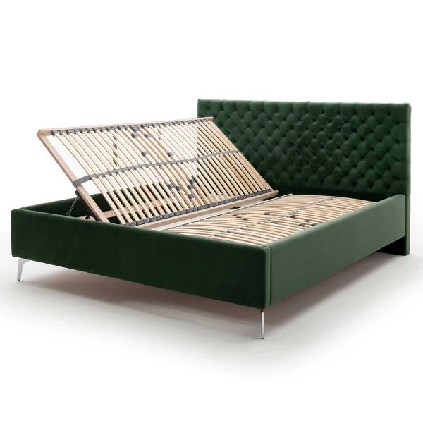 Tweepersoonsbed Janice met chroomkleurige pootjes en bekleed met donkergroene velours. Met opbergruimte onder de lattenbodem. Geschikt voor een matras van 160x200cm; matras niet inbegrepen.