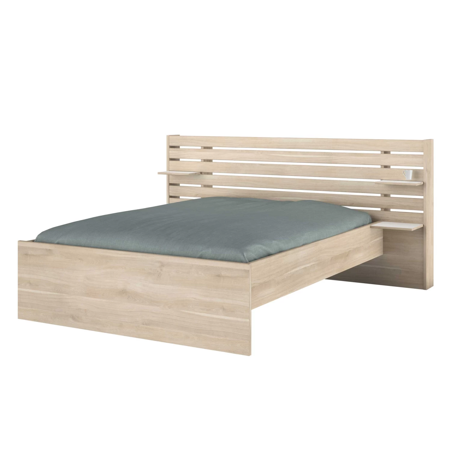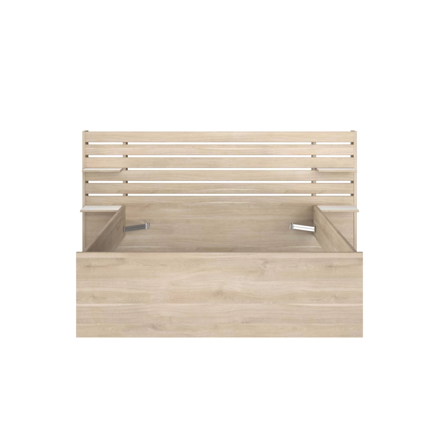 Tweepersoonbed Tokio is gemaakt uit spaanplaat met een kleurencombinatie van wit en Japans eikdecor. Het bed heeft 4 omkeerbare legplankjes.