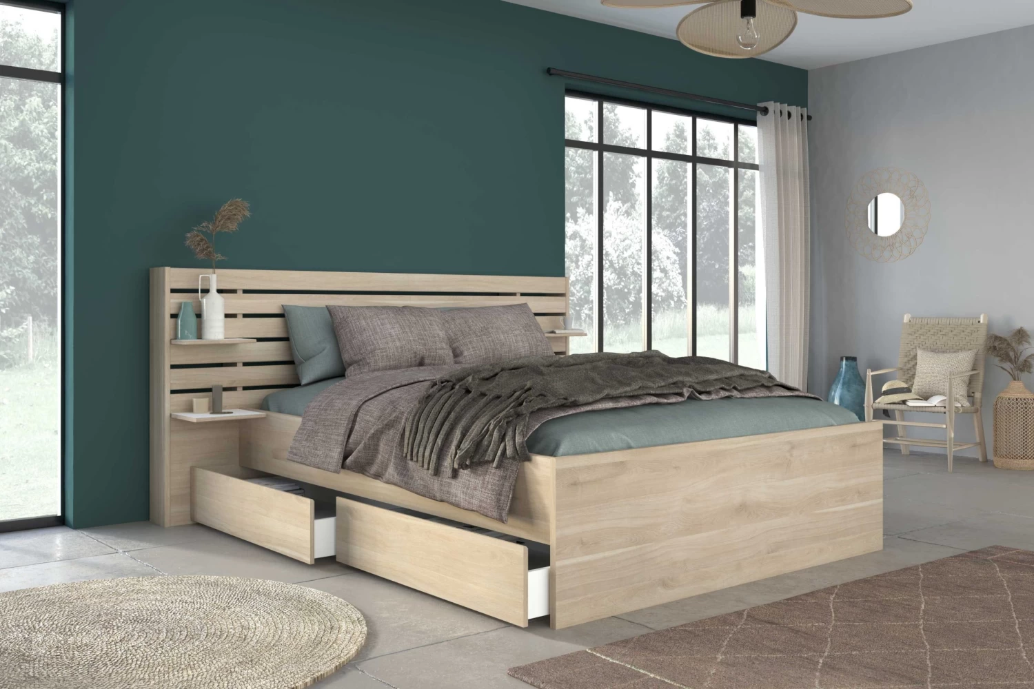Tweepersoonsbed Tokio zorgt met zijn zuivere lijnen en kleurencombinatie van wit en Japans eikdecor voor een meditatieve sfeer in uw slaapkamer. Het hoofdbord heeft meerdere gleuven waarin 4 kleine legplankjes kunnen gemonteerd worden, deze zijn trouwens omkeerbaar waardoor u de look van uw bed naar wens kunt aanpassen. De ene kant is wit en de andere kant is in eikdecor afgewerkt. Indien u opbergruimte wenst kunt u het bed nog aanvullen met onze set lades van de Tokio-collectie die u op onze site kunt vinden. Combineer gerust met onze andere meubels van de Tokio-collectie.