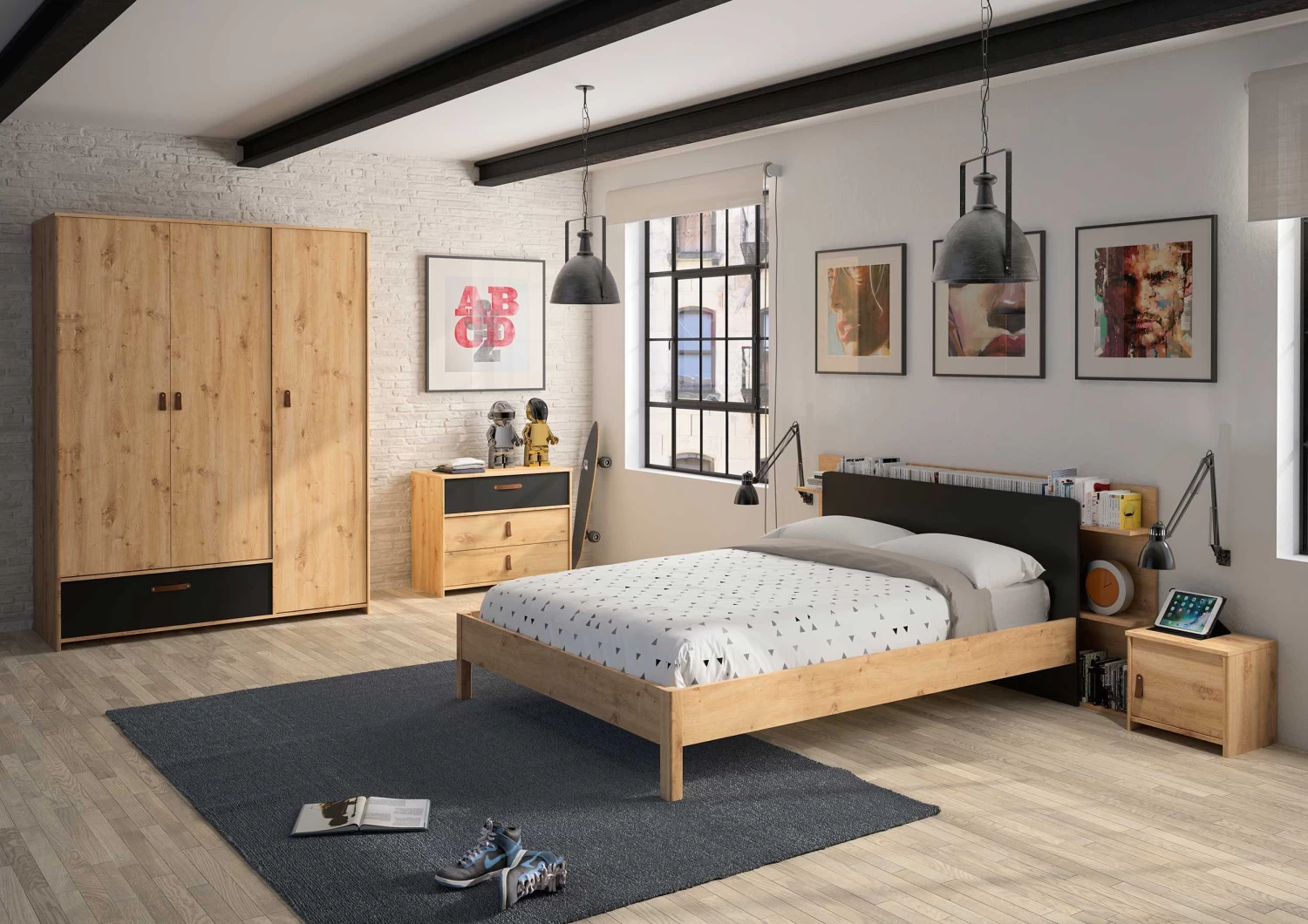 De slaapkamermeubelen uit de Liam collectie zijn vervaardigd uit spaanplaat met een artisan eikdecor. De zwarte accenten en bruine, lederen handgrepen geven een stoere toets aan de meubelen.Â
