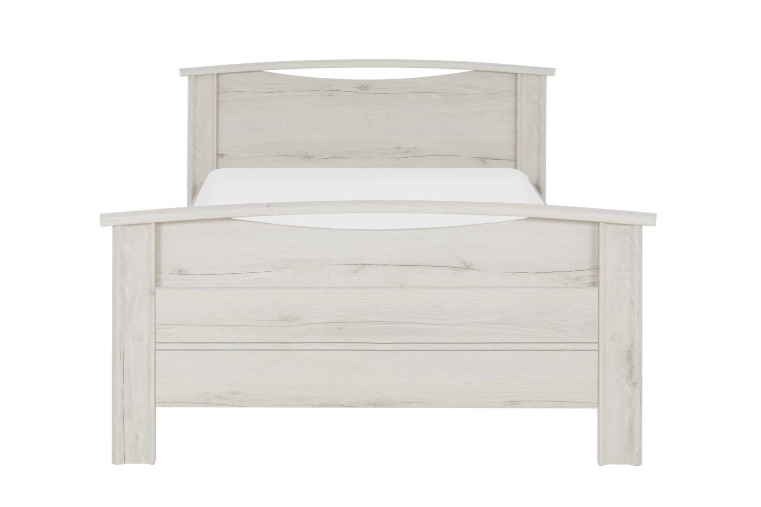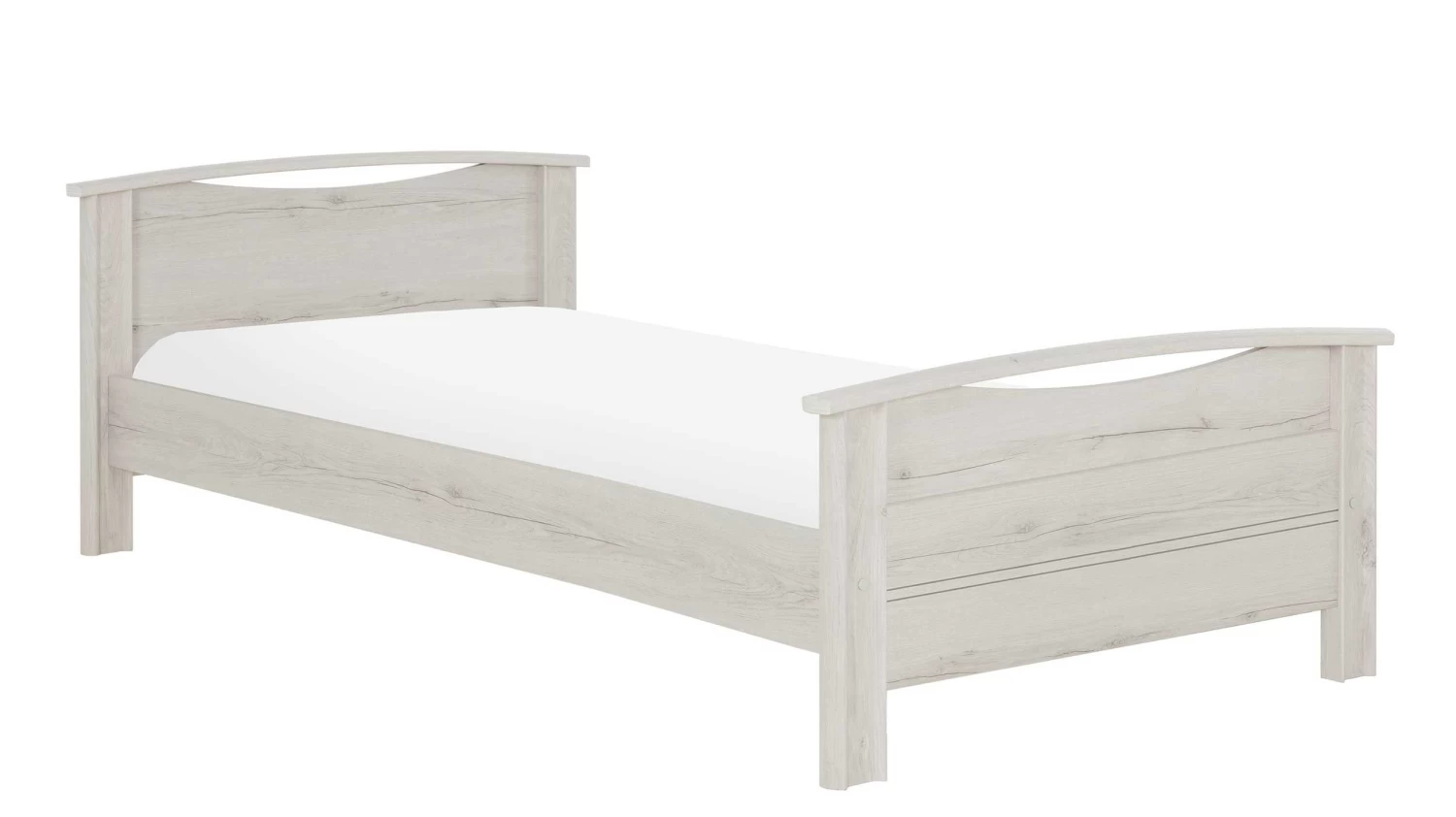 Eenpersoonsbed Morris, geschikt voor een lattenbodem en matras van 120×200 cm. Gemaakt van spaanplaat met imitatieprint van gebleekte helvezia eik. Optioneel: bedlade