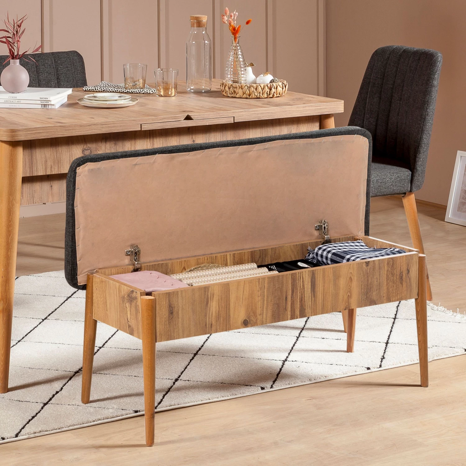 Vella Bank: Gemaakt van 100% gemelamineerd spaanplaat met haagbeuken poten en 100% linnenstof. Met opbergruimte en afmetingen 110x48x40cm. Kleur: Atlantic Pine Antraciet.