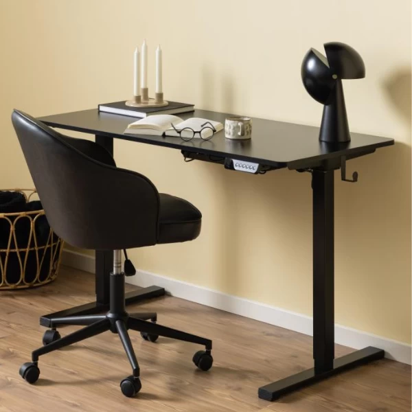 Bureau Garcia 120x60x73cm uit spaanplaat met afwerking in zwarte melamine en stalen poten. In hoogte verstelbaar.