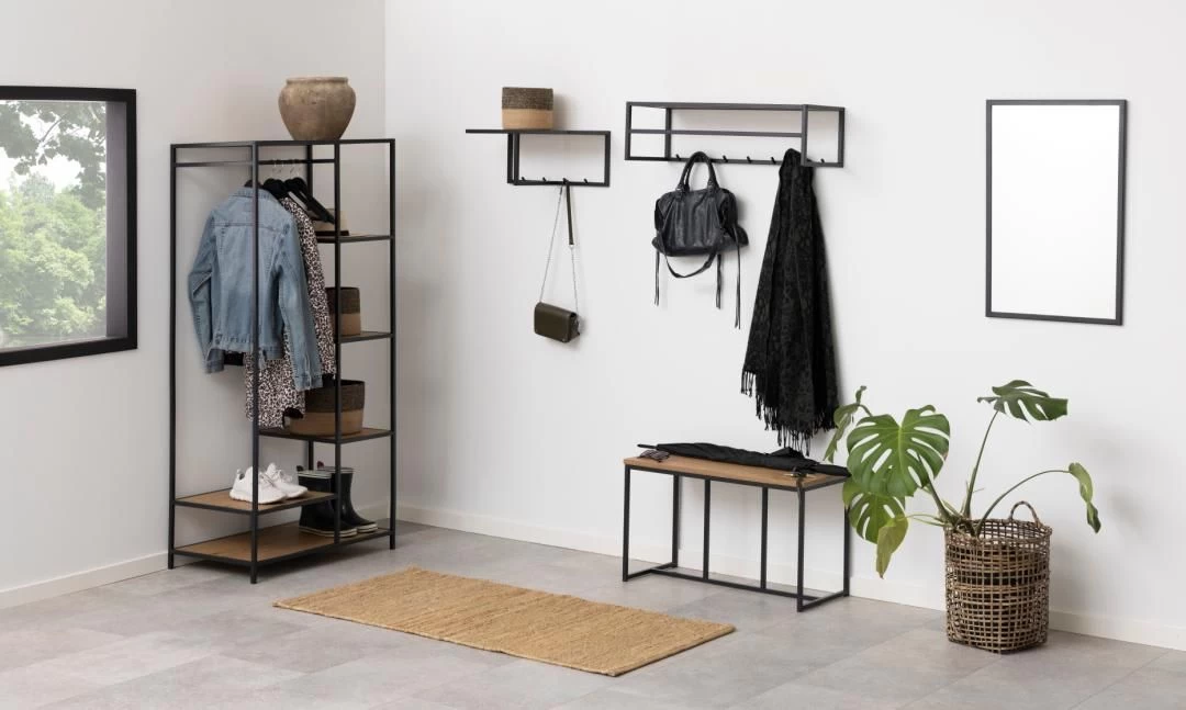 Vestiaire Dover, uitgerust met vier legplanken en één kledingroede. Gemaakt uit zwart gepoedercoat metaal met legplanken uit wilde eik decor.