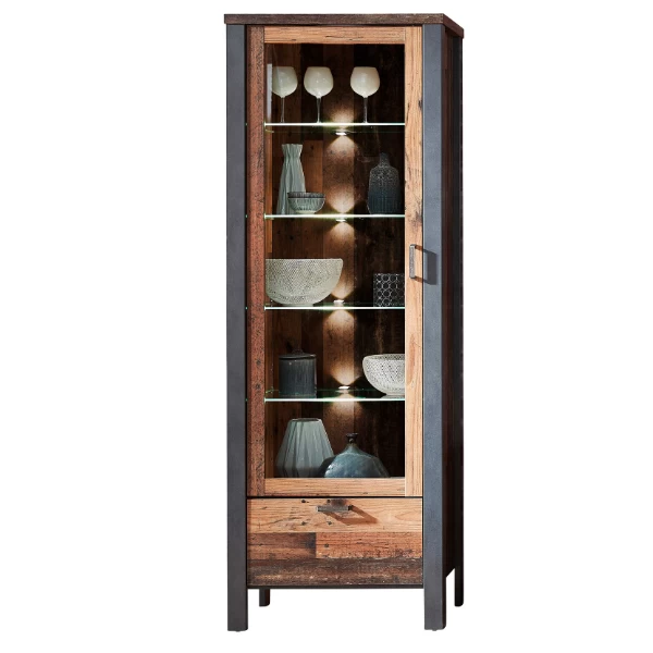 Vitrinekast Carthago 69x40x194cm uit spaanplaat met een look van oud hout. Met twee glazen deuren en één lade. Met metalen handgrepen en LED-verlichting. Â
