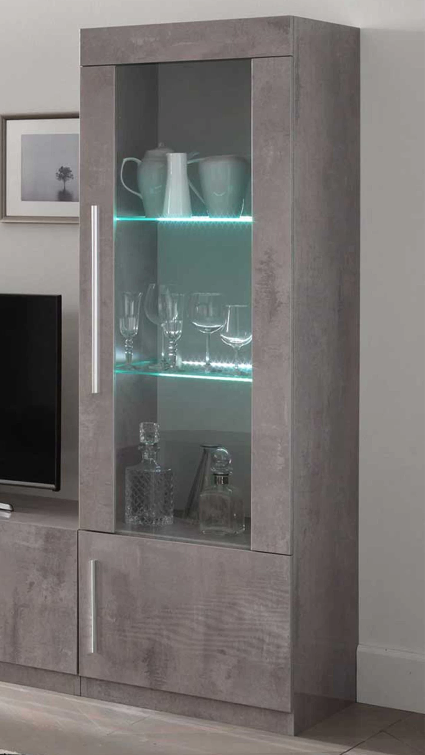 Deze vitrinekast met elegante, metalen handgrepen is uitgerust met een glasdeur en een gewone deur. Achter de glasdeur vind je 3 legplanken. De bovenste 2 legplanken zijn uit 5 mm dik glas en hebben ledverlichting.Â