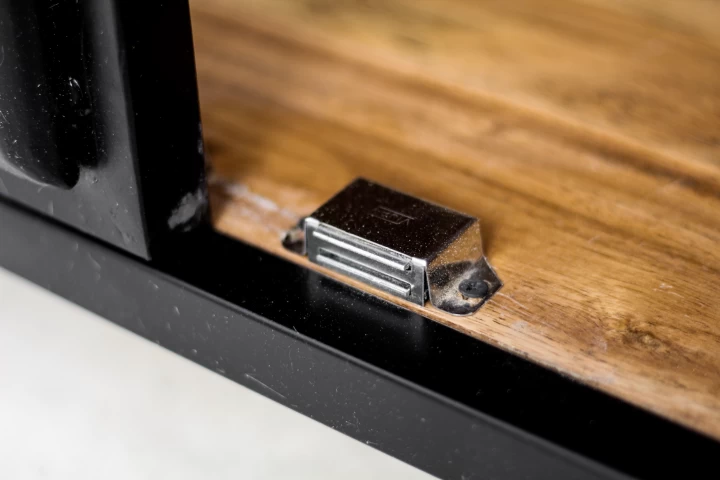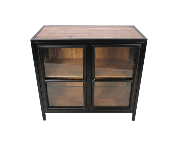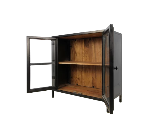 hout en metaal. Door de glazen deuren berg je jouw favoriete spullen veilig weg