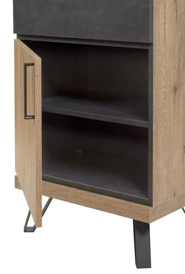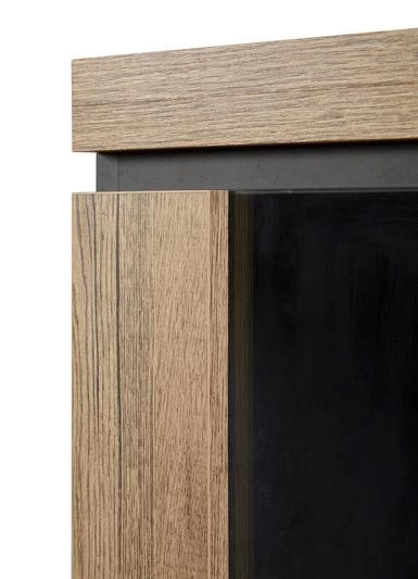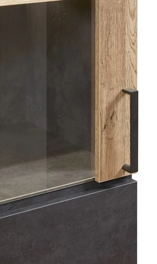 Met hun warm houtdecor en zwarte details past de collectie Netta perfect in de industriële woontrend. Deze vitrinekast is gemaakt uit spaanplaat en is afgewerkt in imitatie eik. De metalen details zorgen voor een stoere uitstraling. In deze kast heb je zowel plaats om allerlei spullen netjes uit het zicht op te bergen, als om je mooiste souvenirs en decoratie uit te stallen. Dankzij de ingebouwde LED-verlichting komt alles nog meer tot zijn recht. Bekijk ook de andere meubels uit de collectie Netta.