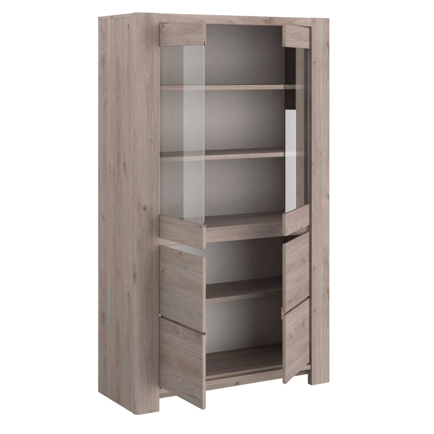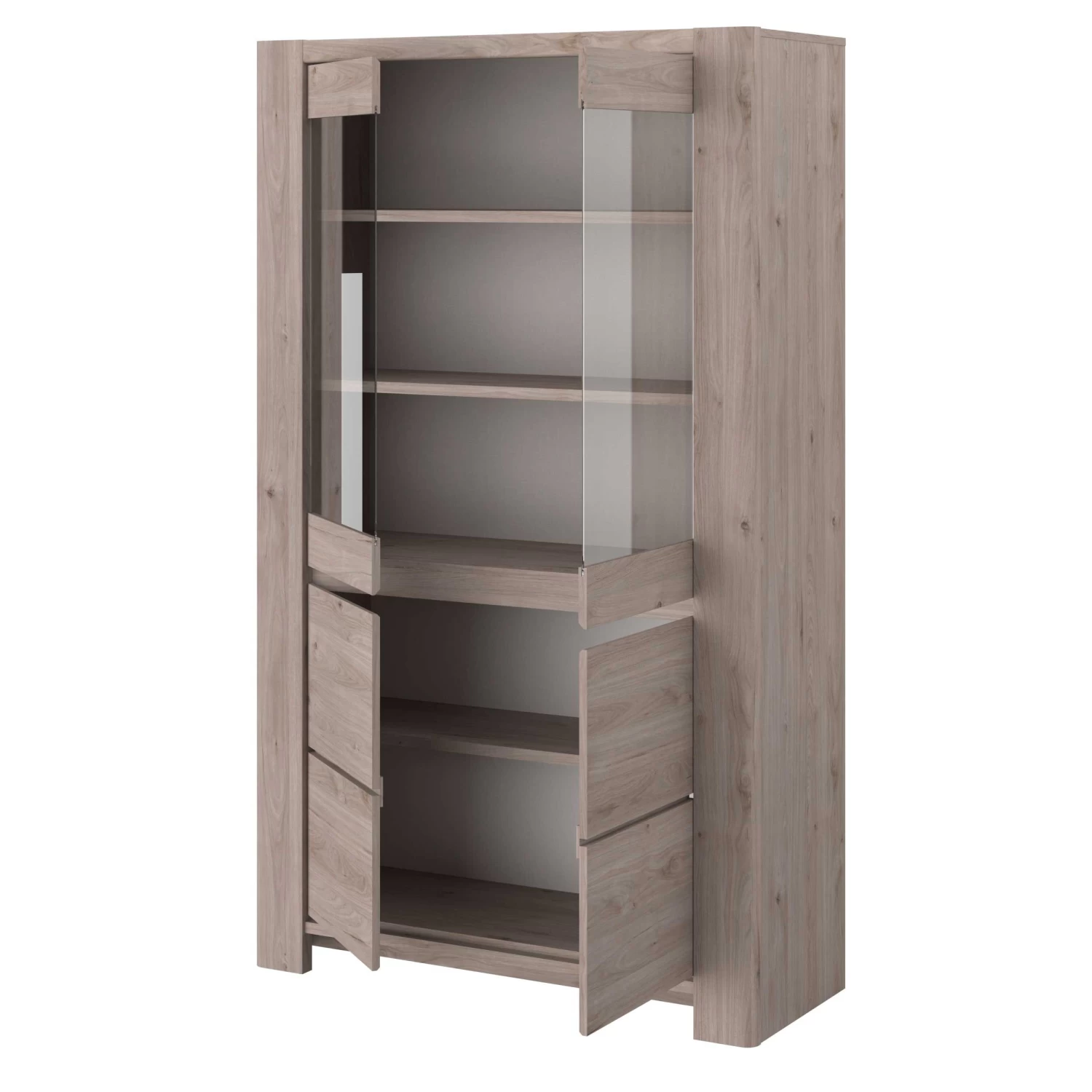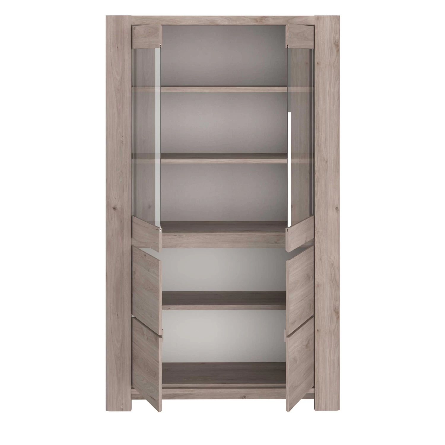 In vitrinekast Porto berg je heel wat praktische en decoratieve objecten op. De kast is uitgerust met drie legplanken en vier deuren, waarvan twee glasdeuren. Hierdoor geef je jouw mooiste decoratie of servies alle aandacht die ze verdienen!