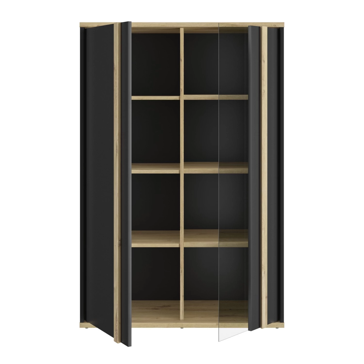 Vitrinekast Ralphio 54x40x190cm uit spaanplaat en MDF. Met twee deuren, waarvan 1 uit glas en 6 legplanken. Afwerking in zwart en eik.