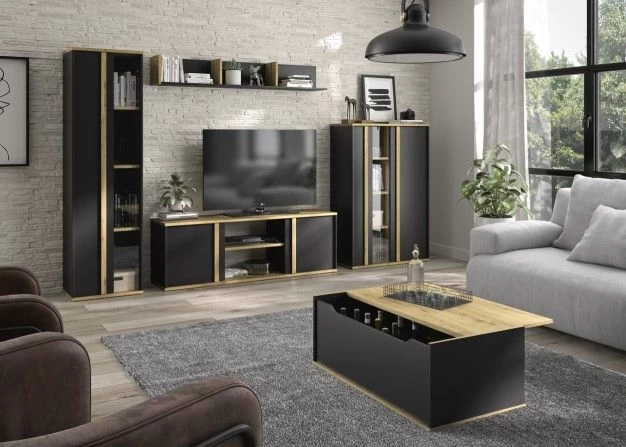 De combinatie van zwart met details in eiklook geven de collectie Ralphio een warme en eigentijdse uitstraling. Dankzij het strakke en minimalistische ontwerp kan deze reeks verschillende mensen bekoren. Deze vitrinekast is gemaakt uit spaanplaat en MDF en heeft 2 deuren waarvan 1 uit glas en spaanplaat. De glazen deur kan zowel links als rechts gemonteerd worden. Deze kast is perfect om je verzameling of mooiste decoratiestukken uit te stallen en toch te beschermen tegen stof. Combineer met de andere meubels uit de reeks Ralphio voor een mooi geheel.