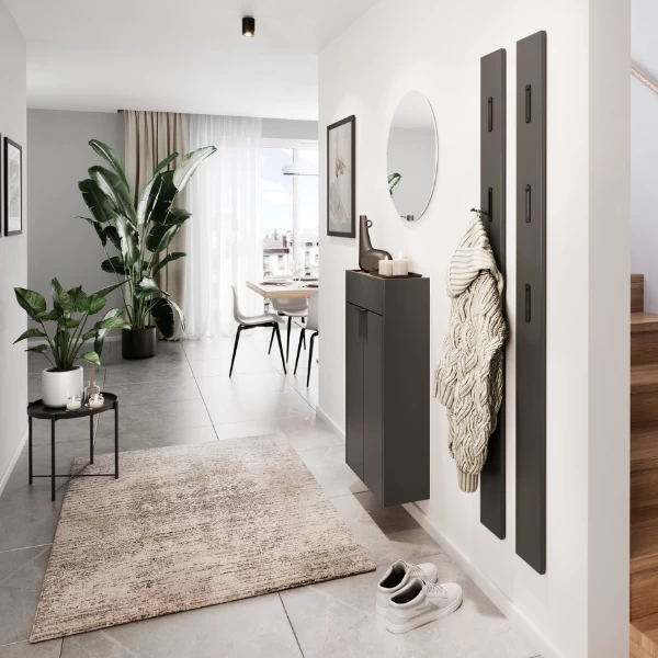 Met de trendy meubelen Amika geniet je van een opgeruimde inkomhal. Deze wandkapstok is gemaakt uit spaanplaat en afgewerkt met melamine in antraciet. De kapstok is uitgerust met drie uitklapbare metalen haken die elk 5kg kunnen dragen. De kapstokken Amika kunnen aan de muur bevestigd worden. Zo blijft de vloer vrij van rommel. Ontdek de volledige collectie op onze website.