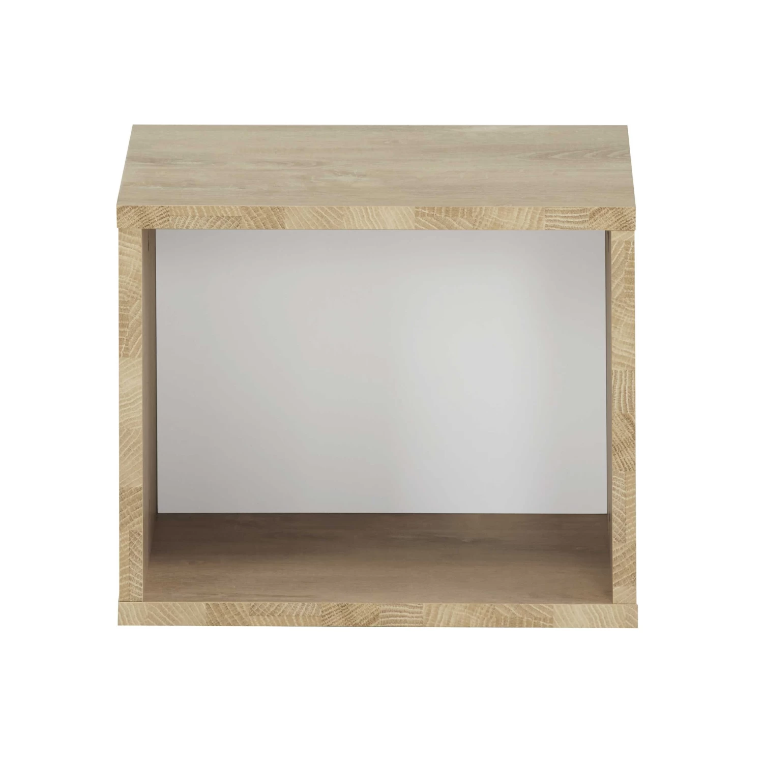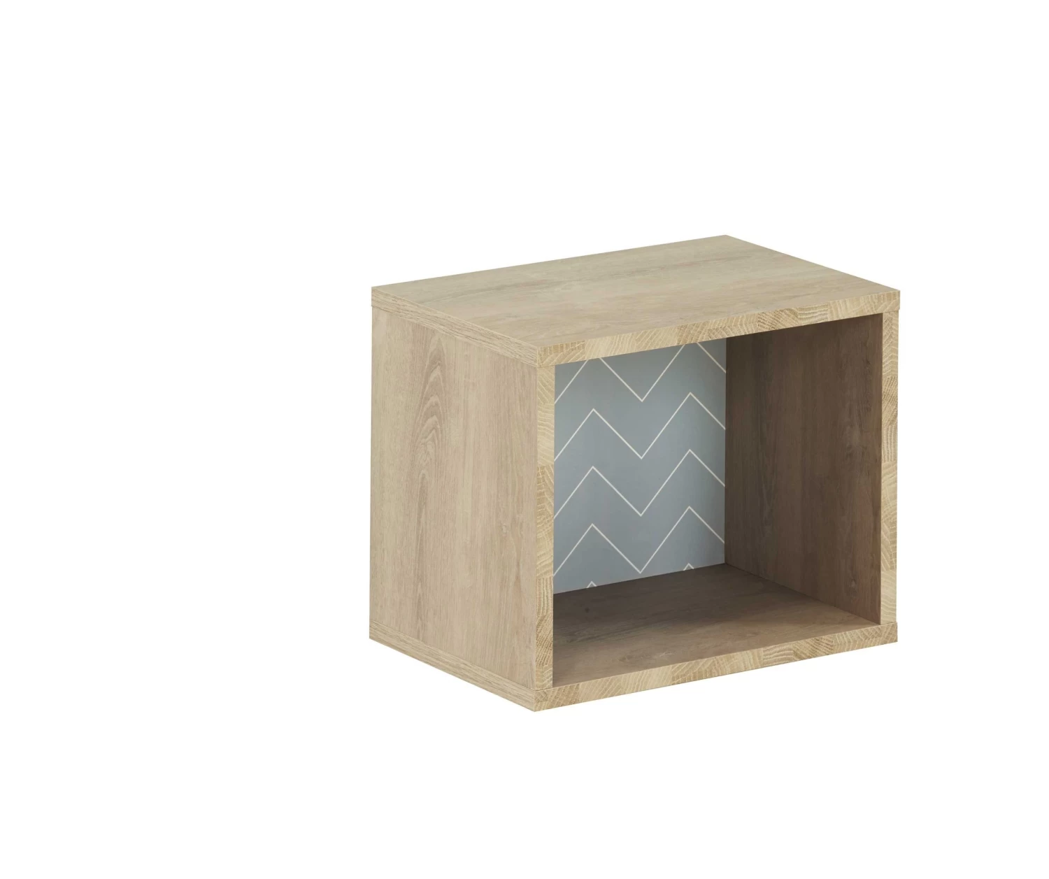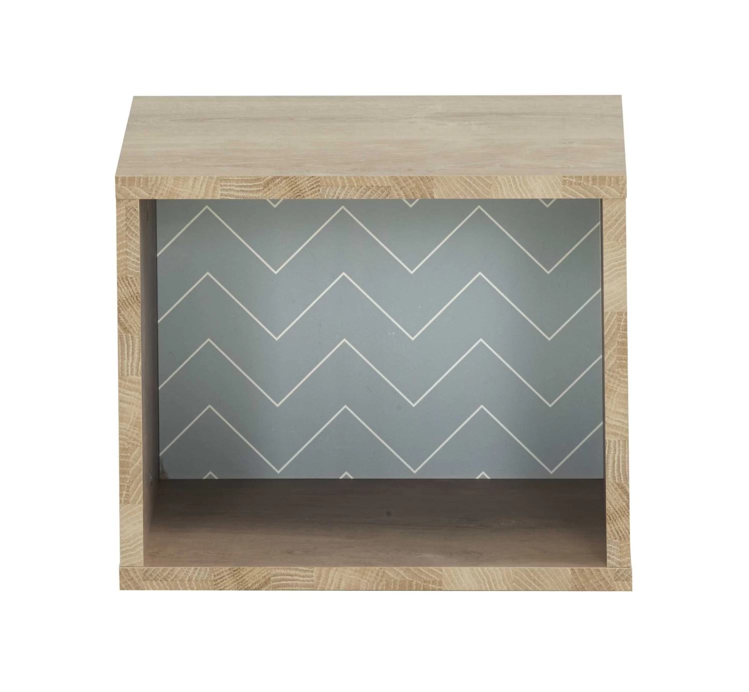 Dit wandkastje vormt de finishing touch van je slaapkamer. Het kastje heeft een achterwand die je langs beide zijden kan gebruiken. De ene kant is effen wit, de andere kant is oceaanblauw met visgraatmotief. Tip: combineer enkele exemplaren zodat zelf je de gewenste opbergruimte samenstelt!
