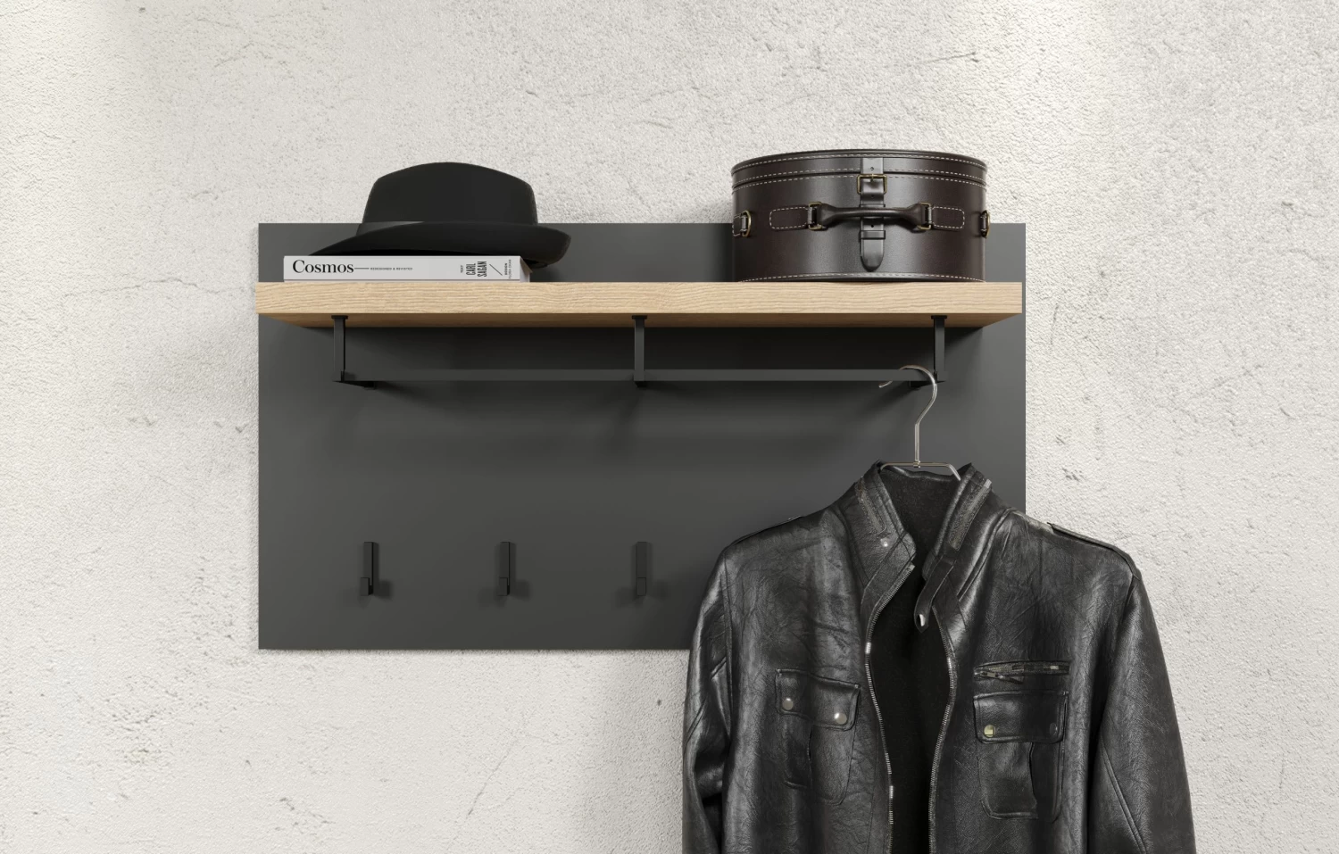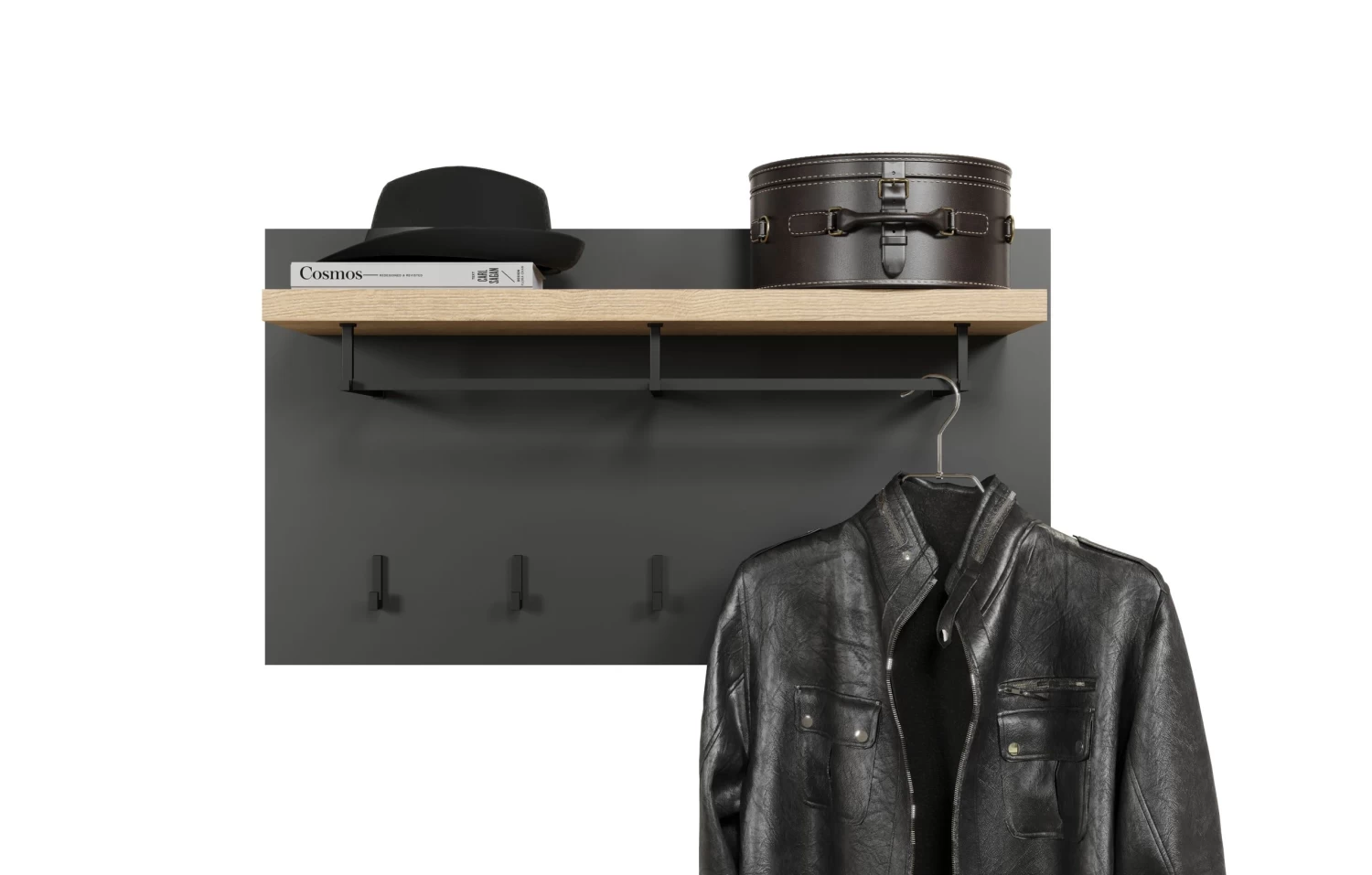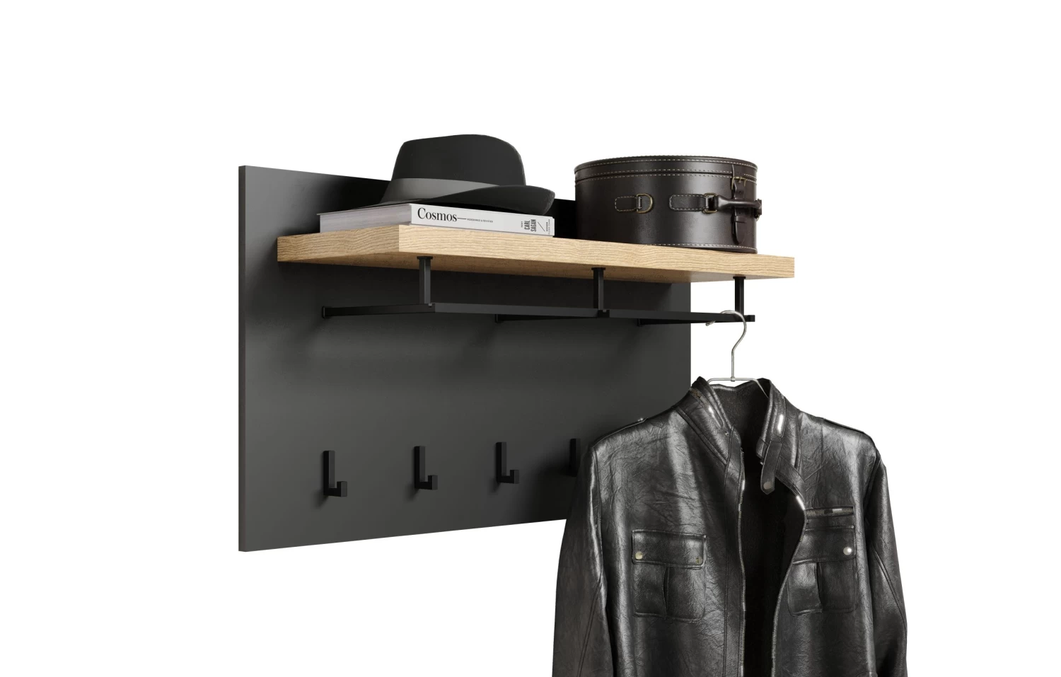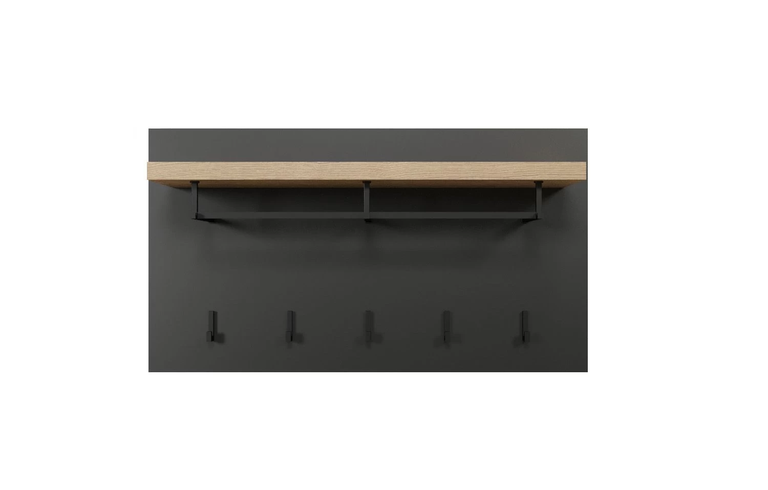 Ons wandpaneel uit de Synnax-serie voegt stijl en organisatie toe aan je huis. Met vijf handige haken en een plank, biedt dit paneel een perfecte oplossing voor het ophangen van jassen en het opbergen van sleutels en accessoires. De stijlvolle antracietkleur geeft een eigentijdse uitstraling aan je interieur. Met een lengte van 90 cm, een diepte van 27 cm en een hoogte van 50 cm, past dit wandpaneel perfect in elke ruimte.