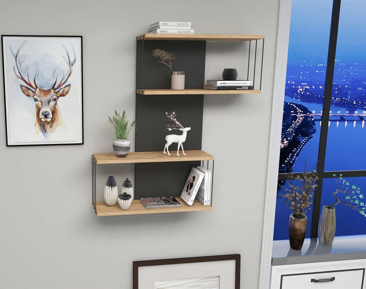 Wandplank is gemaakt van 100% gemelamineerd spaanplaat, in een moderne antraciet eiken kleur. Het heeft verschillende planken en kan eenvoudig aan de muur worden bevestigd. De afmetingen zijn 65 cm breed, 96 cm hoog en 19 cm diep, met een plankhoogte en -breedte van respectievelijk 29 cm en 48 cm.
