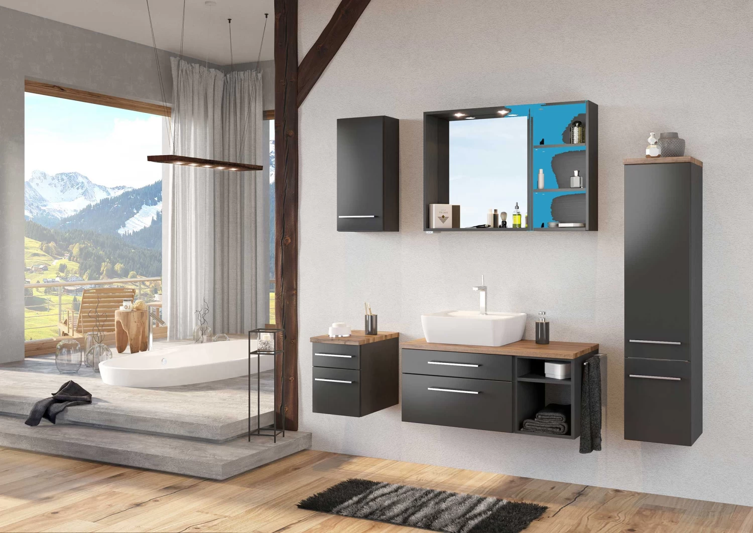 De meubelset Dasa in grijs zorgt voor een leuke, trendy sfeer in je badkamer. De combinatie van de gemelamineerde spaanplaat in grafietgrijs en de afwerking van de voorkant in donkergrijze, matte MDF schept een erg solide, aangenaam geheel. Het wandrek is uitgerust met twee legplanken die ideaal zijn om je toiletgerief gemakkelijk te kunnen opbergen. Dit wandrekje is perfect compatibel met de spiegel van dezelfde reeks. Ontdek ook de rest van de witte, mat grijze en wotaneiken Dasa-collectie bij Emob!Â