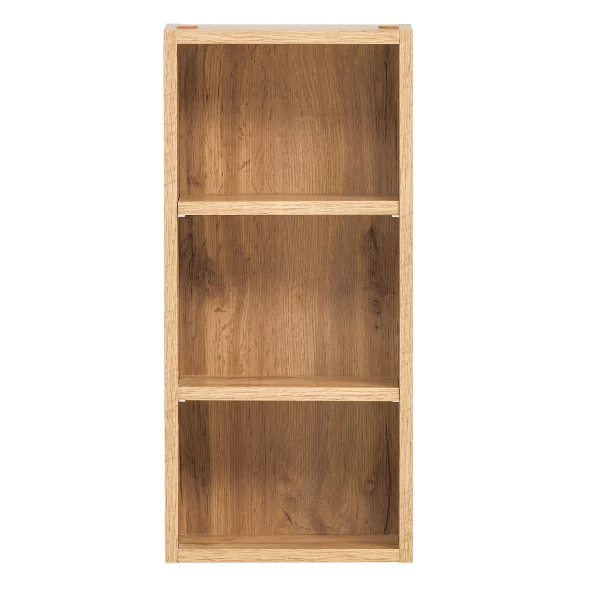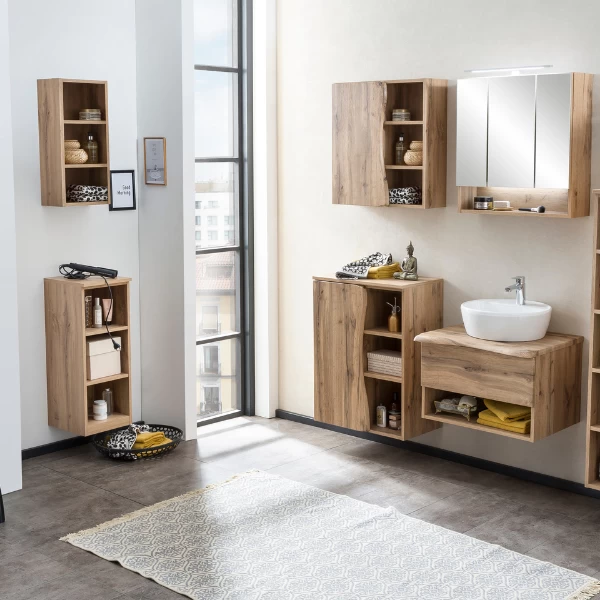 Bent u nog op zoek naar stijlvolle meubelen om je badkamer in te richten? De collectie Karan combineert functionaliteit met opvallend ontwerp. Dit wandrekje is gemaakt uit spaanplaat en is afgewerkt met melamine in eiklook en is eenvoudig aan de muur te bevestigen. Dankzij de twee legplanken creëer je extra opbergruimte voor je badkamerspullen binnen handbereik. Ontdek de volledige collectie Karan op onze website.