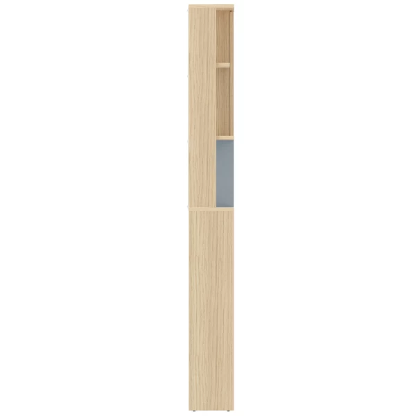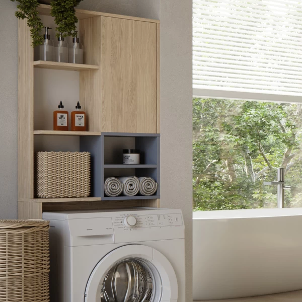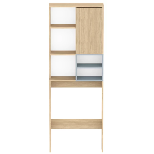 Deze wasmachinekast in licht eikdecor creëert veel lichtinval in uw badkamer. De kleuraccenten in celadon grijs geven de kast een speelse afwerking. In de 5 open vakken kun je wasmiddel, een doos wasknijpers en gastendoekjes leggen. Achter de draaideur zijn nog 2 opbergvakken voor allerlei wasproducten voorzien. Schroeven en pluggen voor wandmontage niet inbegrepen.Â