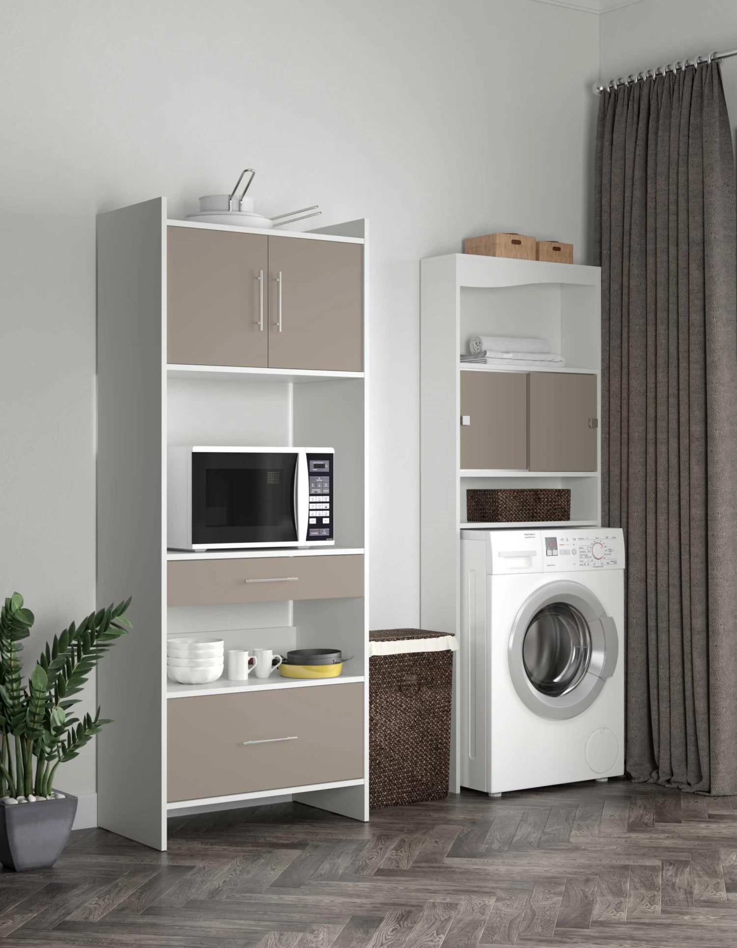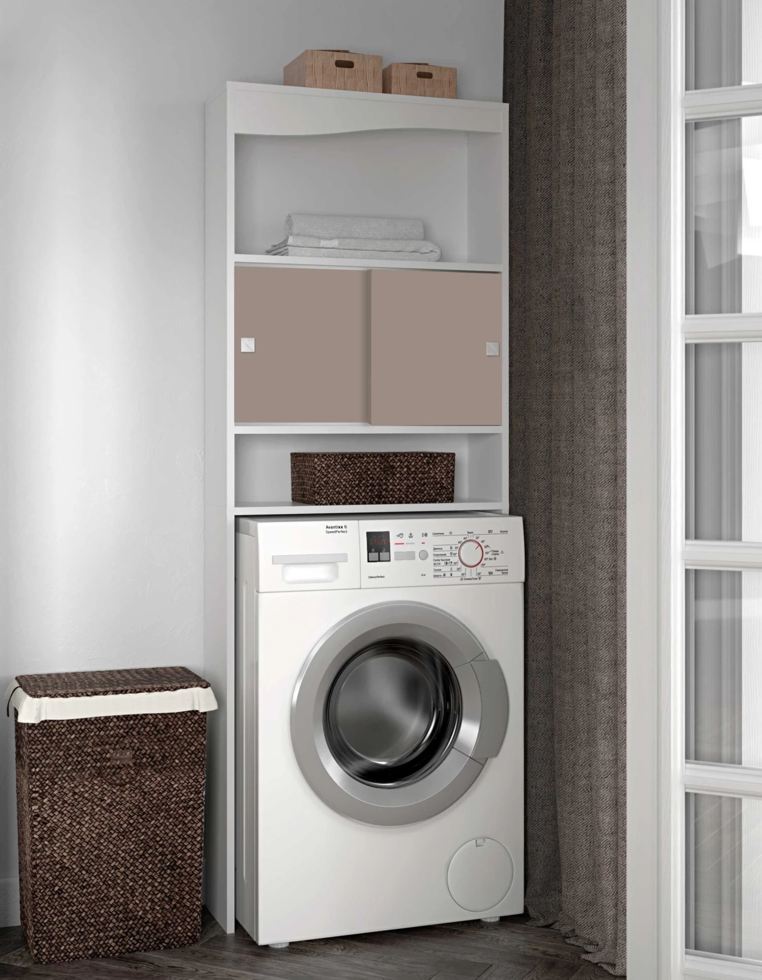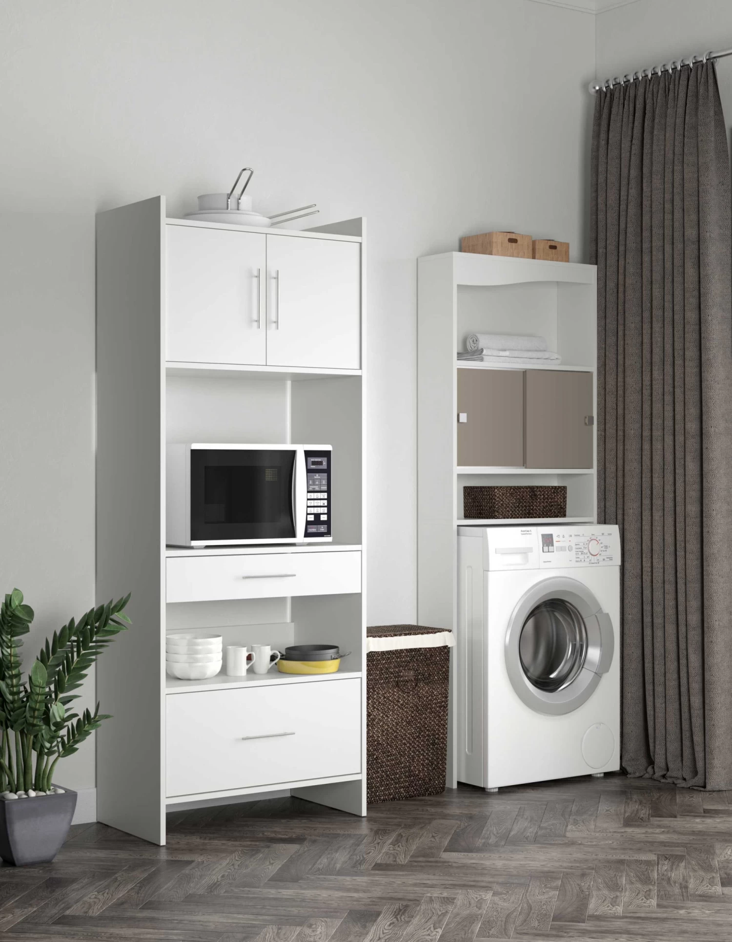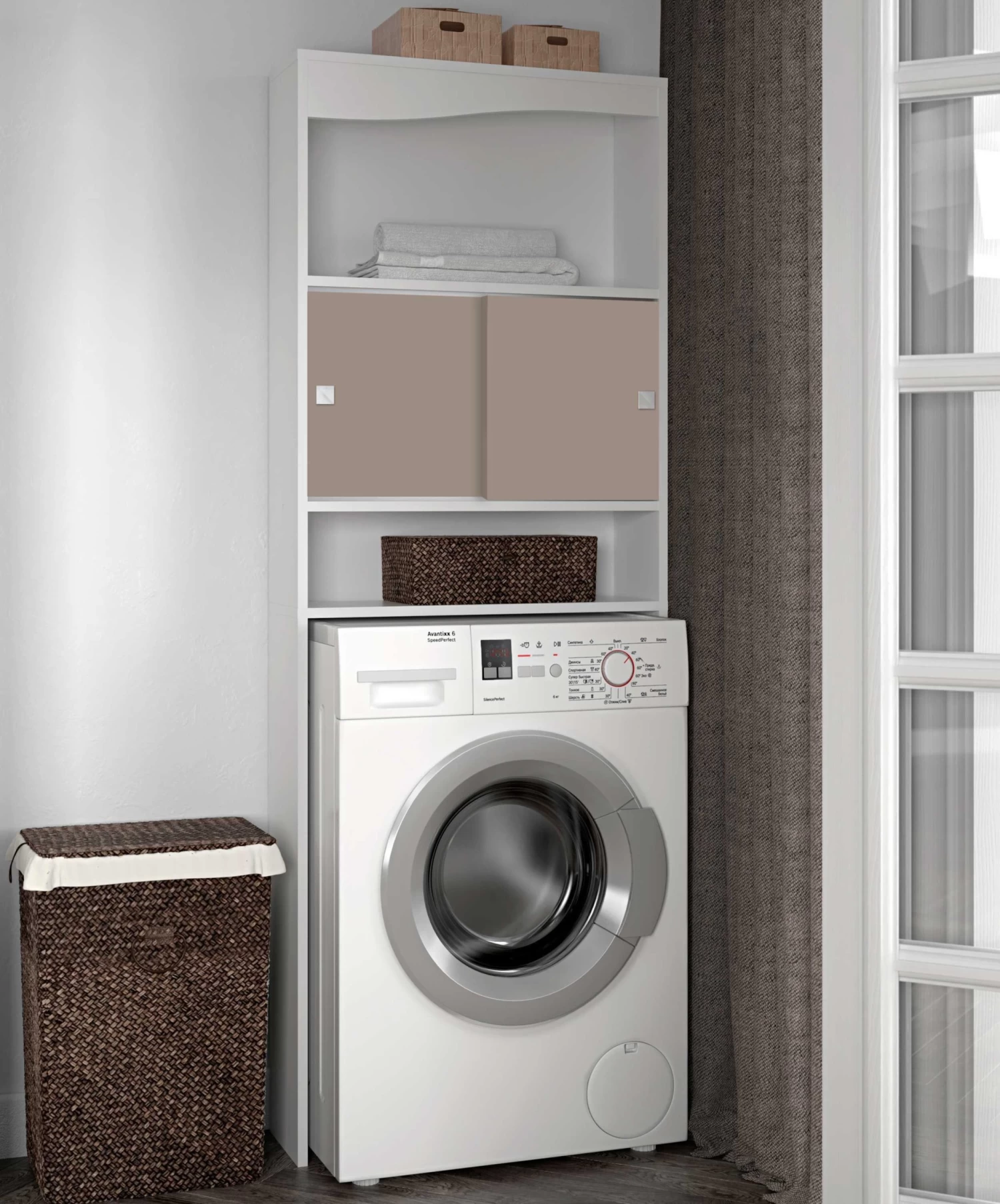 Combineer je toilet, wasmachine of droger met extra opbergruimte dankzij deze praktische kast met 2 taupe schuifdeuren (16mm dik) op rails en 2 open vakken. Kast Willa is gemaakt van spaanplaat en kreeg een witte afwerking. Schroeven en pluggen voor wandmontage niet inbegrepen.