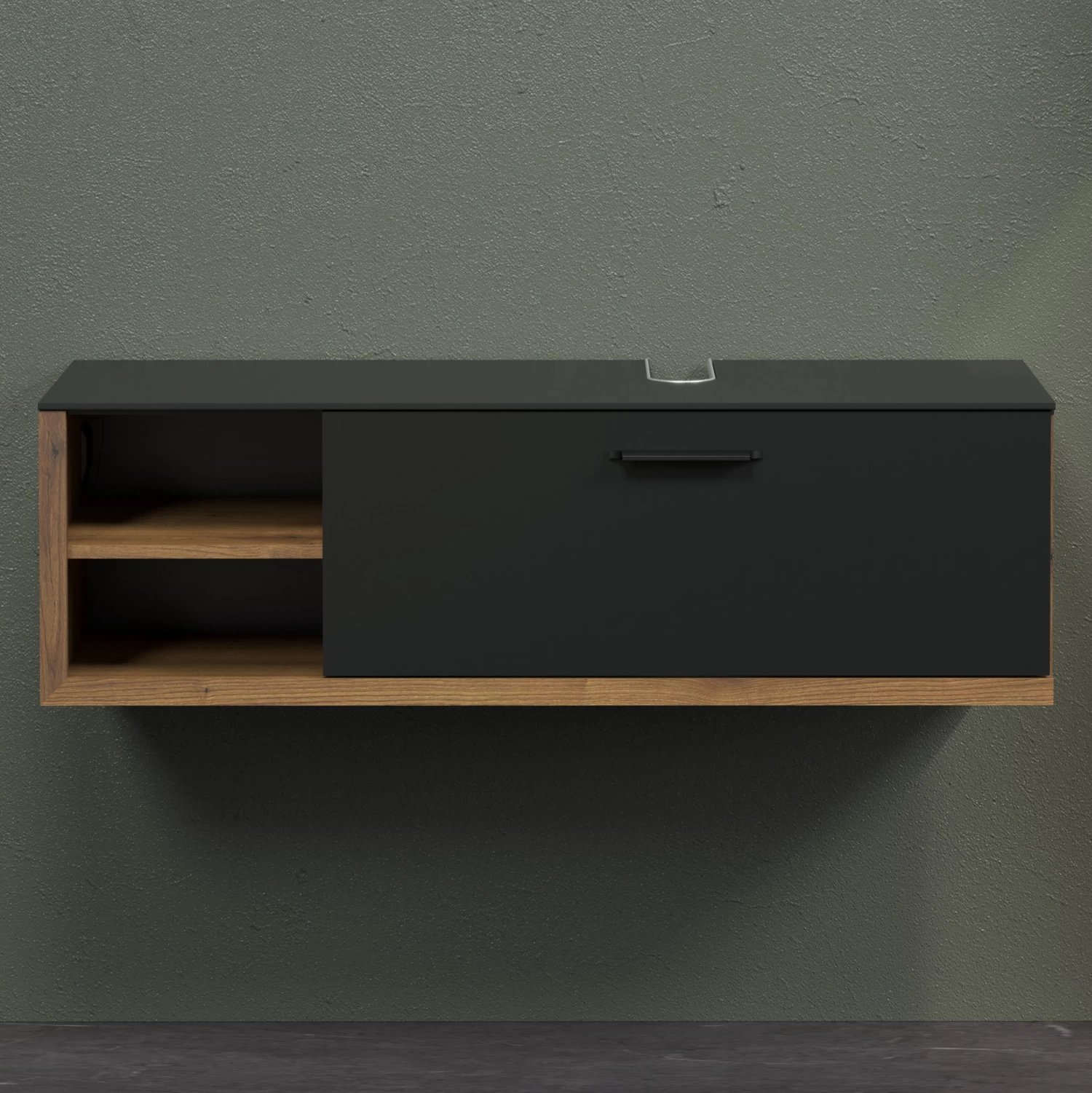 Upgrade je badkamer met onze wastafelkast uit de Synnax-serie. Deze kast combineert moderne stijl met handige opbergruimte. Met een eigentijds eiken ontwerp en stijlvolle antracietkleur voegt deze kast niet alleen een vleugje design toe aan je badkamer, maar biedt het ook praktische opslag.