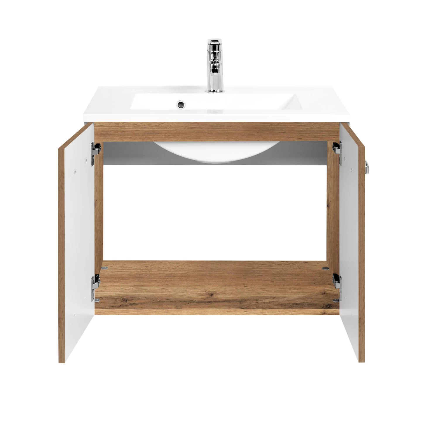 Geef je badkamer een warme make-over met de meubelen van de Bobbi-collectie, waartoe ook dit compacte wastafelmeubel van 70 cm breed behoort. Het meubel is uitgerust met een witte wastafel en 2 deuren. Het is gemaakt van gemelamineerde spaanplaat met eikdecor.