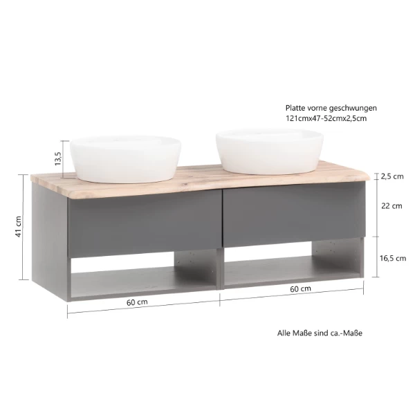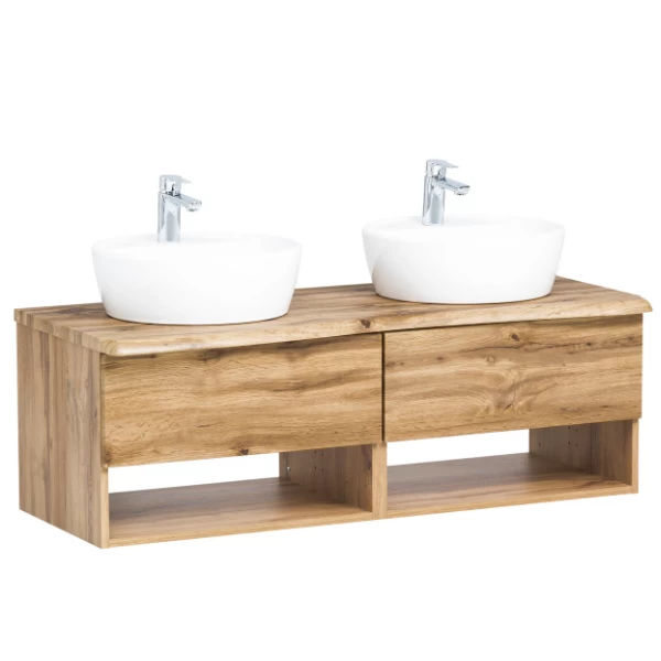 Wastafelmeubel Karan 121x47x55cm uit spaanplaat en MDF met 2 lades. Inclusief twee keramische wastafels. Afwerking met melamine in eikdecor.