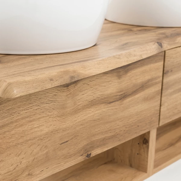 Bent u nog op zoek naar stijlvolle meubelen om je badkamer in te richten? De collectie Karan combineert functionaliteit met opvallend ontwerp. Dit wastafelmeubel is gemaakt uit spaanplaat en MDF en is afgewerkt met melamine in eiklook. De twee keramische wastafels zijn inbegrepen. Het bovenblad heeft een opvallend ontwerp dat aan een boomstam doet denken. Deze organische vorm geeft de badkamer een authentieke en natuurlijke uitstraling. Dankzij de twee lades heb je plaats om allerlei badkamerspullen netjes op te bergen. Alles wat je binnen handbereik wil hebben, kan je opbergen in de nis. Dit wastafelmeubel bestaat in drie verschillende formaten. Ontdek de volledige collectie Karan op onze website.